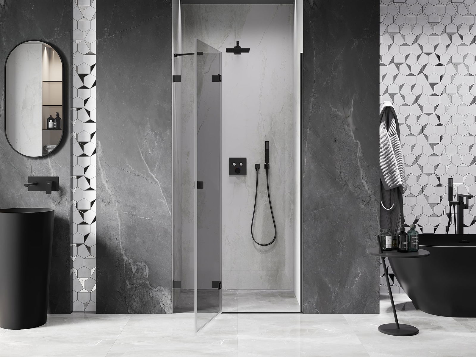 A handy and comfortable handle made from durable and resistant metal. Its trendy shape combined with a finish matched to the colour of the profiles gives the whole a modern and stylish look, highlighting the aesthetics of every bathroom.