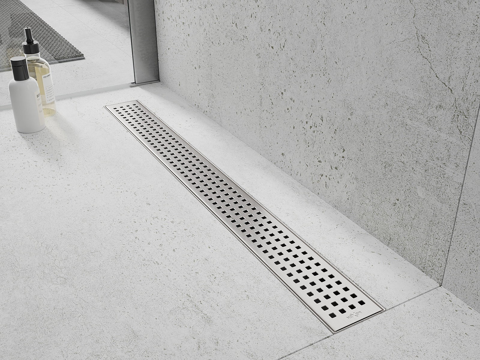 The linear drain is mounted at a depth of only 52 mm. The shallow depth allows for easier preparation of the surface for the drain installation and easy leveling, ensuring high aesthetics and effective water drainage.