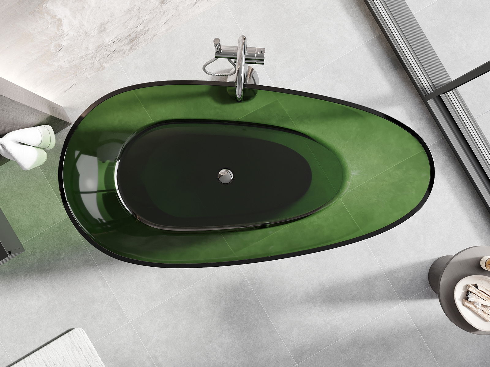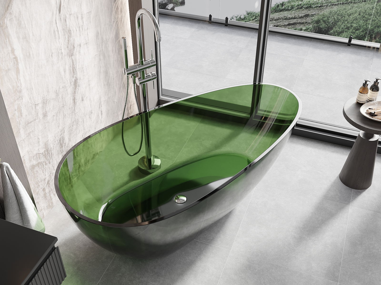 This is a modern material combining an elegant appearance with high durability. It is resistant to mechanical damage, easy to clean, and pleasant to the touch. The transparent form and thin rim of the bathtub add lightness and unique character, creating an impactful accent in bathroom design.