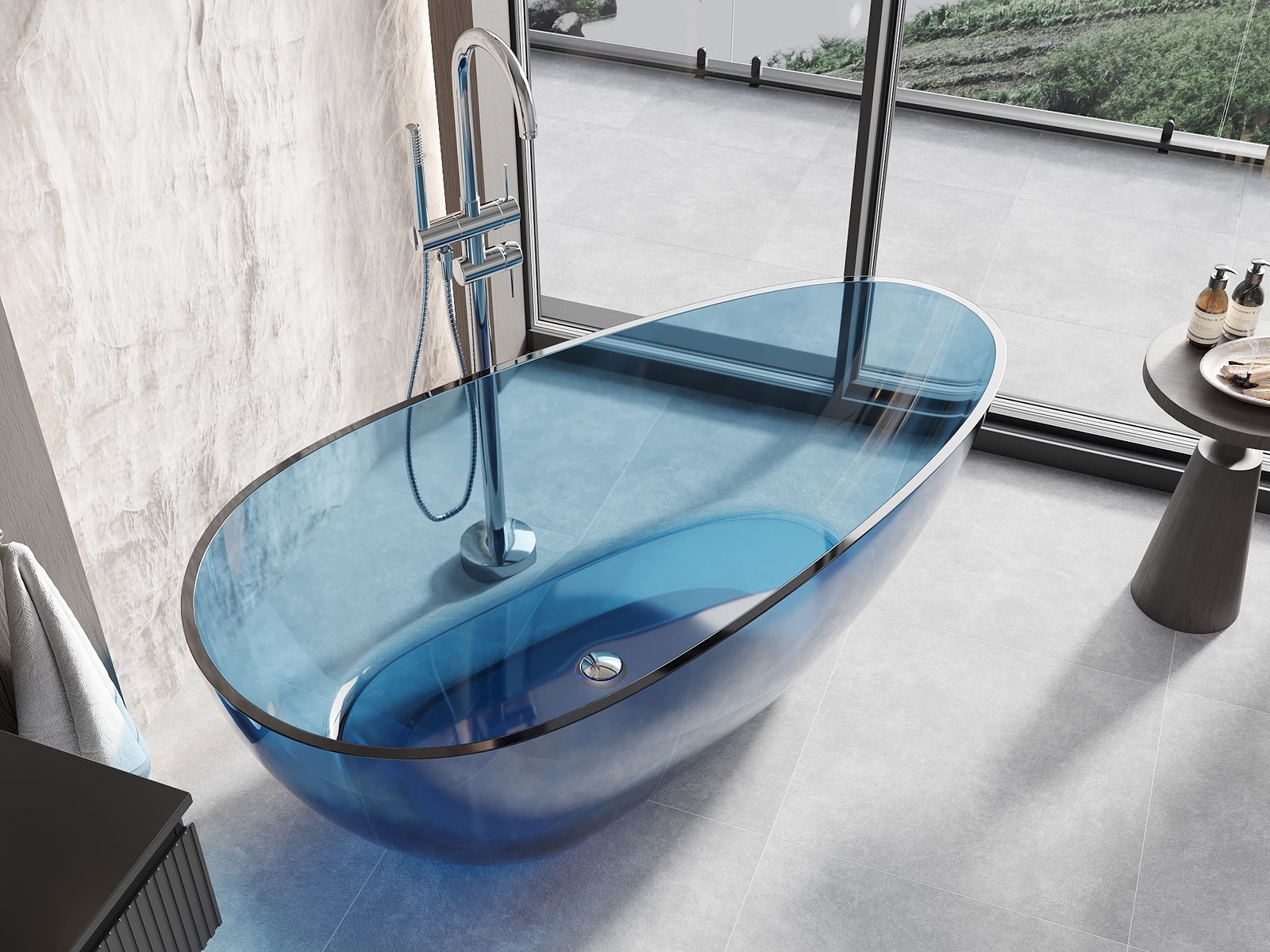 This is a modern material combining an elegant appearance with high durability. It is resistant to mechanical damage, easy to clean, and pleasant to the touch. The transparent form and thin rim of the bathtub add lightness and unique character, creating an impactful accent in bathroom design.