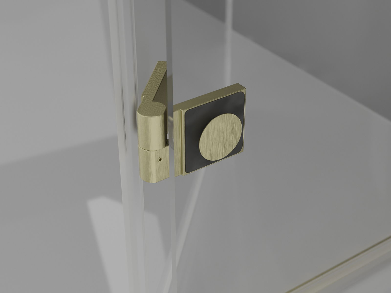 Brass hinges flush with the glass panel