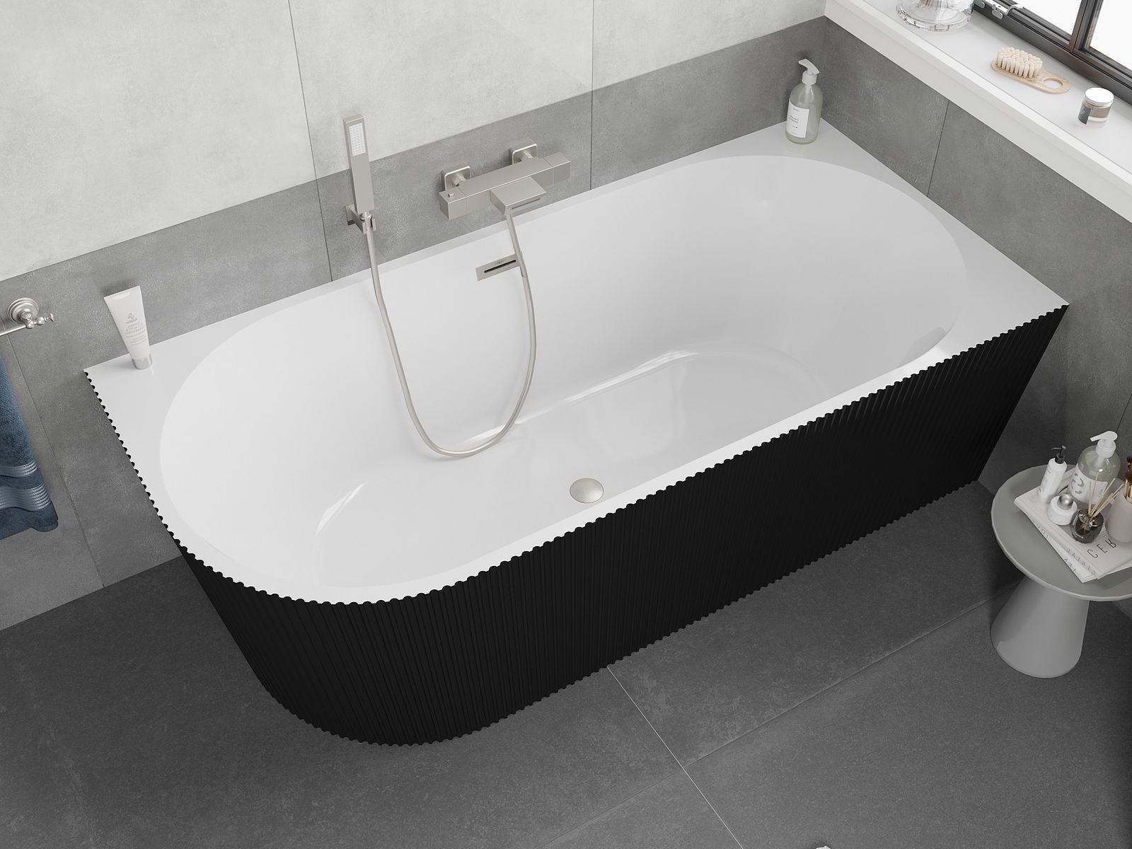 Mexen Silo freestanding corner bathtub right fluted 170 x 80 cm, white/black, brushed nickel overflow - 52891708075P-97