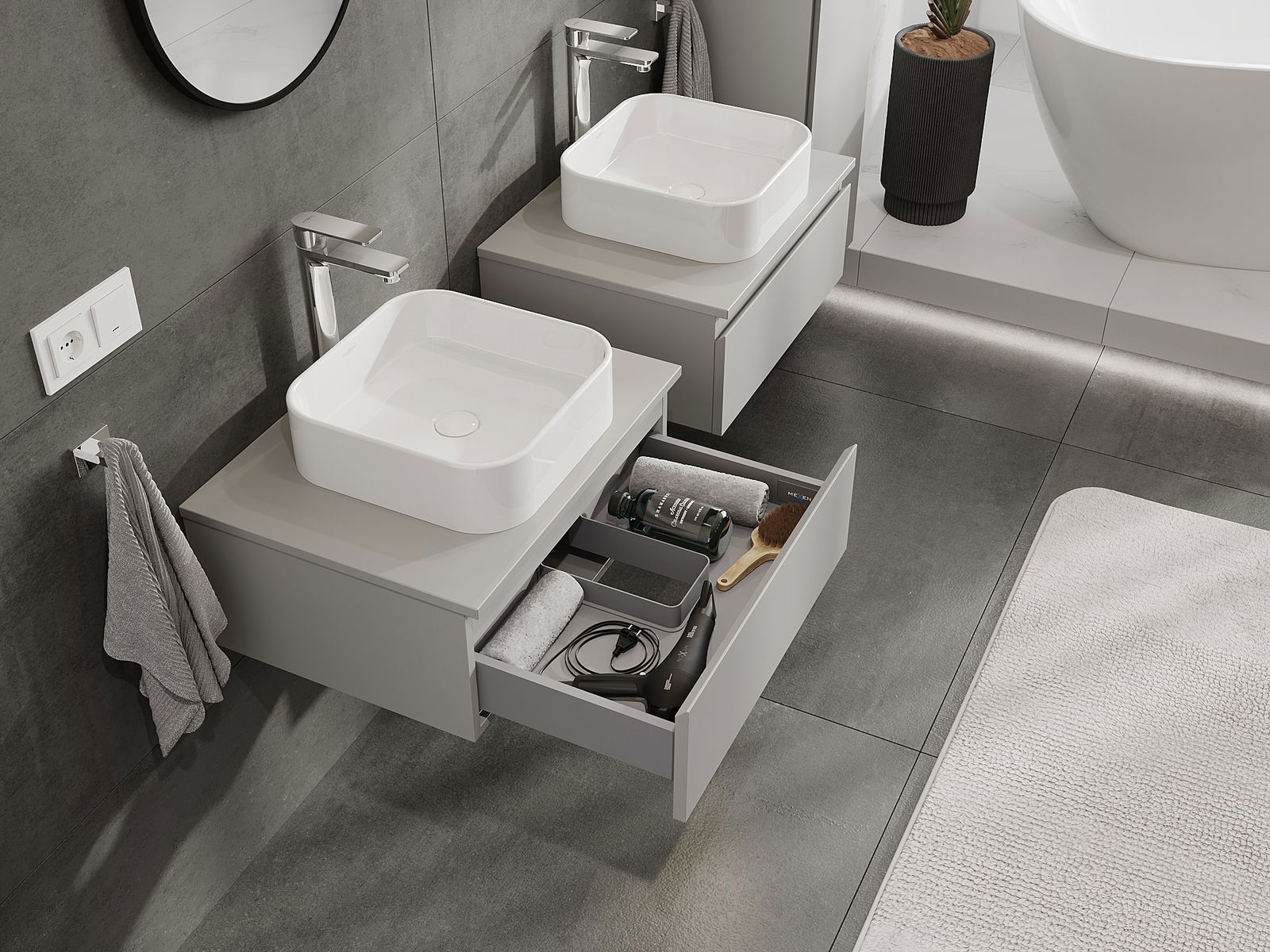 Our modular bathroom furniture can be combined in various colour configurations, allowing for complete personalisation. You can choose both the appearance and functions of individual elements, enabling you to adapt the furniture to your own stylistic and functional preferences.