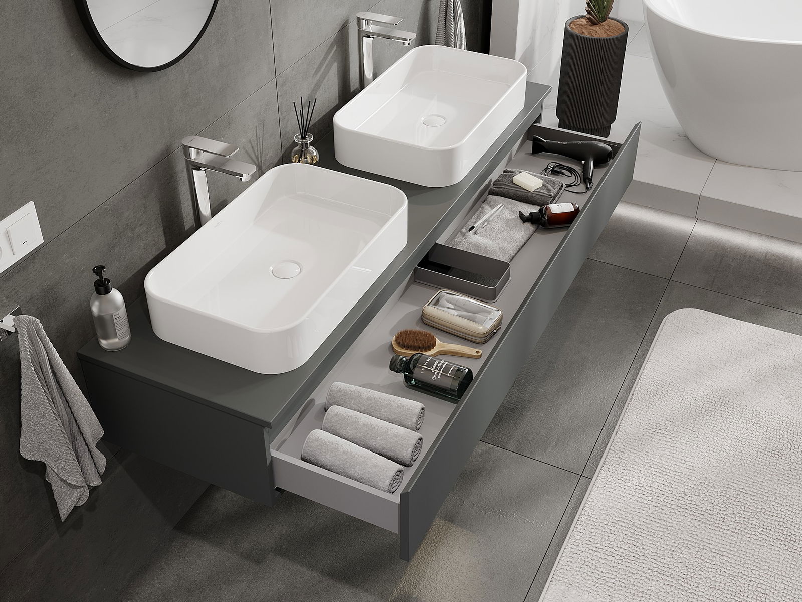 Our modular bathroom furniture can be combined in various colour configurations, allowing for complete personalisation. You can choose both the appearance and functions of individual elements, enabling you to adapt the furniture to your own stylistic and functional preferences.