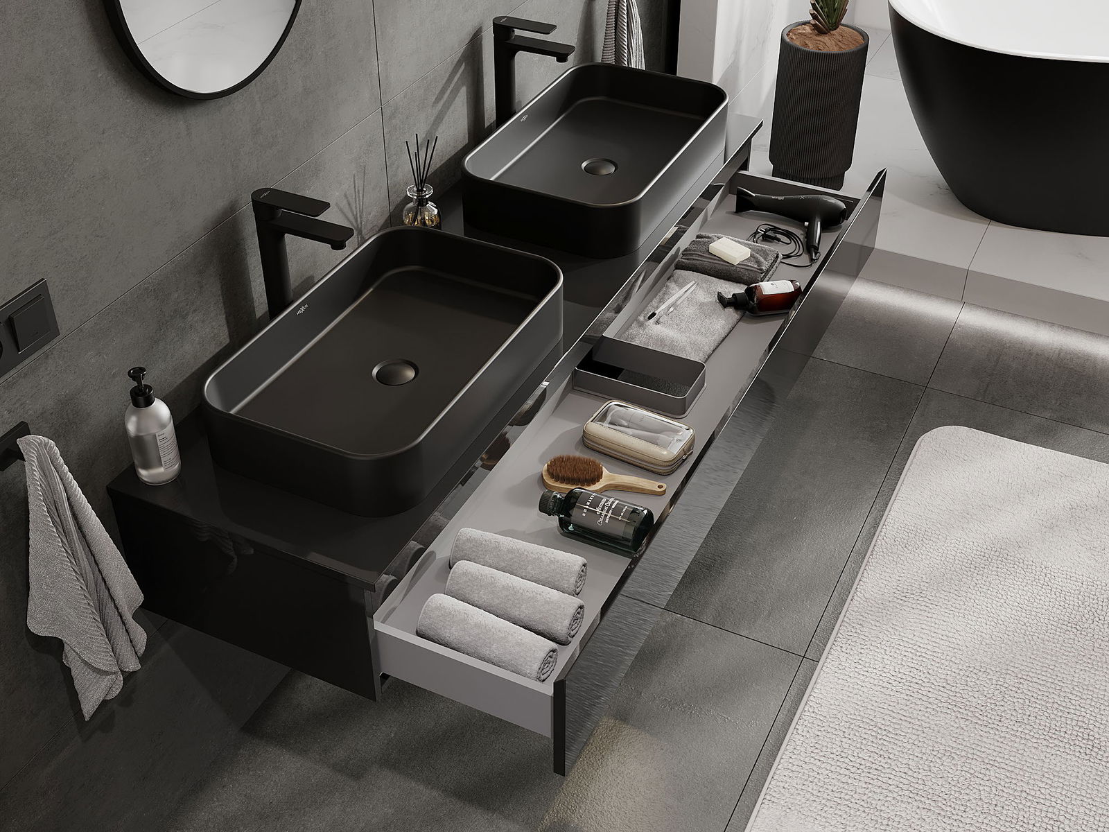 Our modular bathroom furniture can be combined in various colour configurations, allowing for complete personalisation. You can choose both the appearance and functions of individual elements, enabling you to adapt the furniture to your own stylistic and functional preferences.