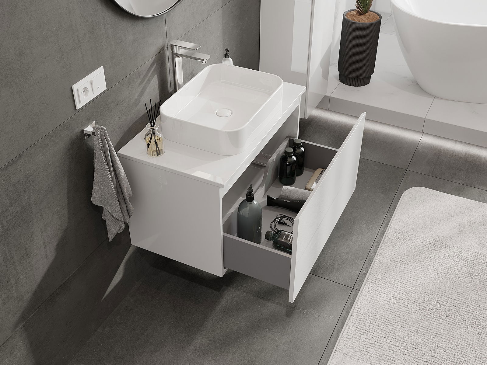 Our modular bathroom furniture can be combined in various colour configurations, allowing for complete personalisation. You can choose both the appearance and functions of individual elements, enabling you to adapt the furniture to your own stylistic and functional preferences.
