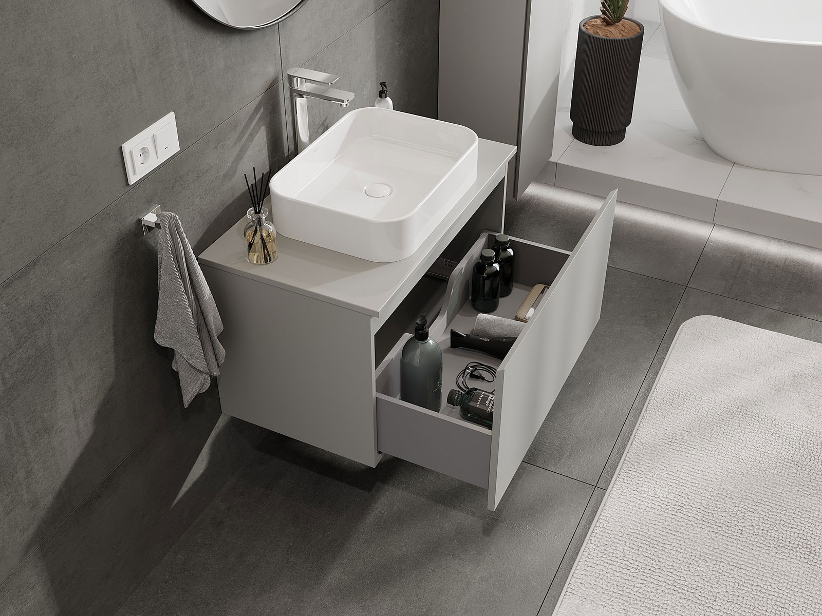 Our modular bathroom furniture can be combined in various colour configurations, allowing for complete personalisation. You can choose both the appearance and functions of individual elements, enabling you to adapt the furniture to your own stylistic and functional preferences.