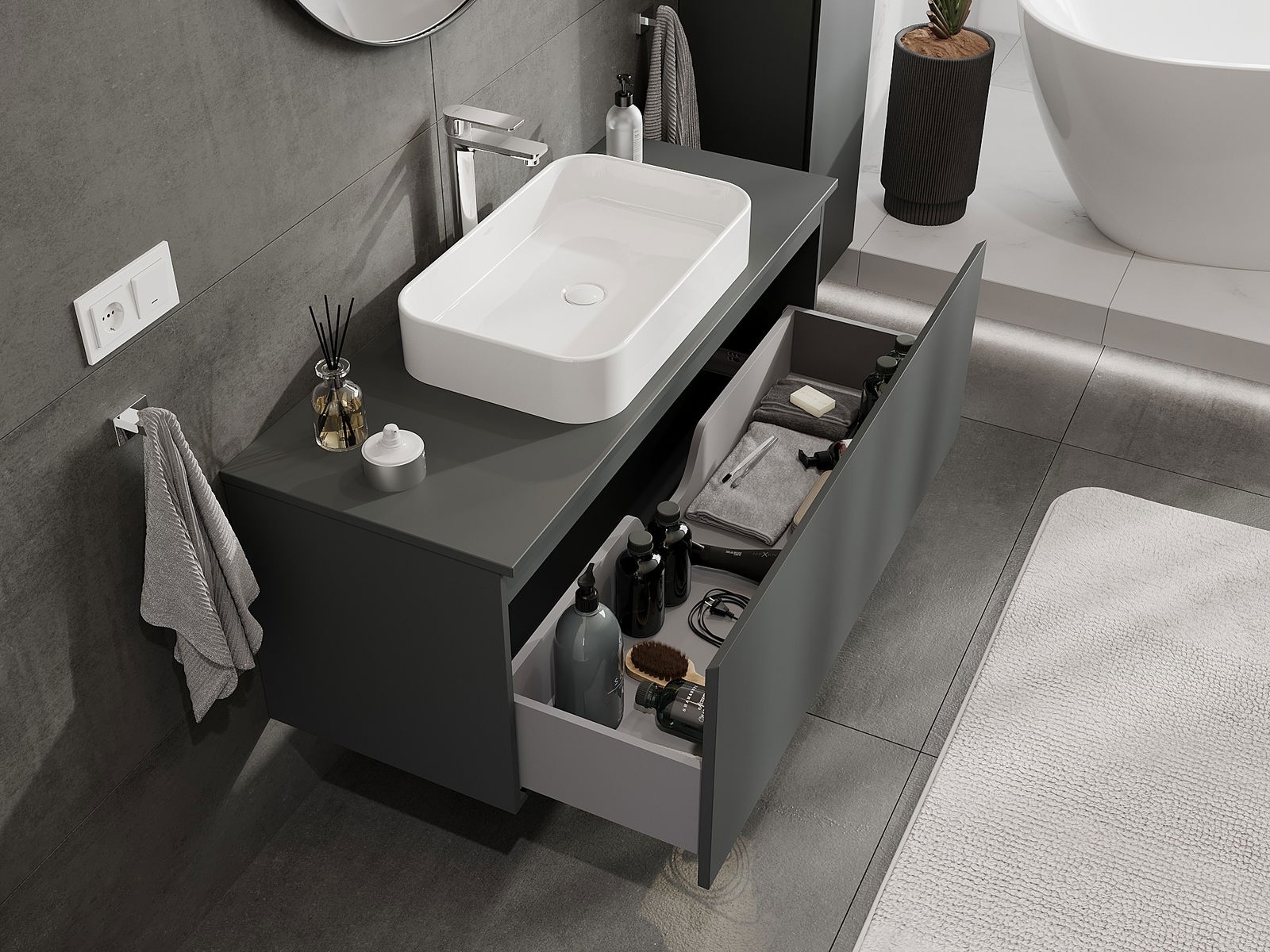 Our modular bathroom furniture can be combined in various colour configurations, allowing for complete personalisation. You can choose both the appearance and functions of individual elements, enabling you to adapt the furniture to your own stylistic and functional preferences.