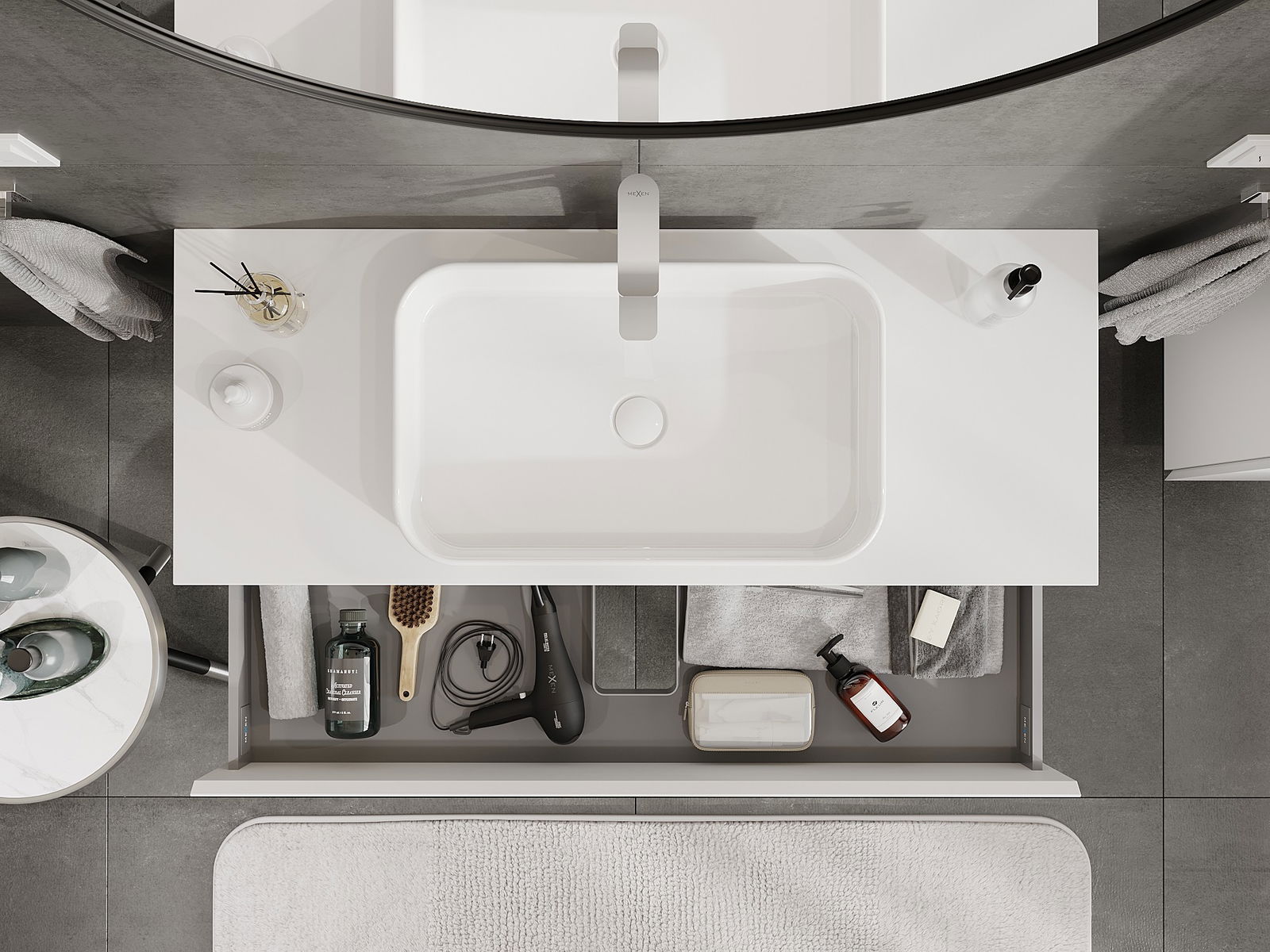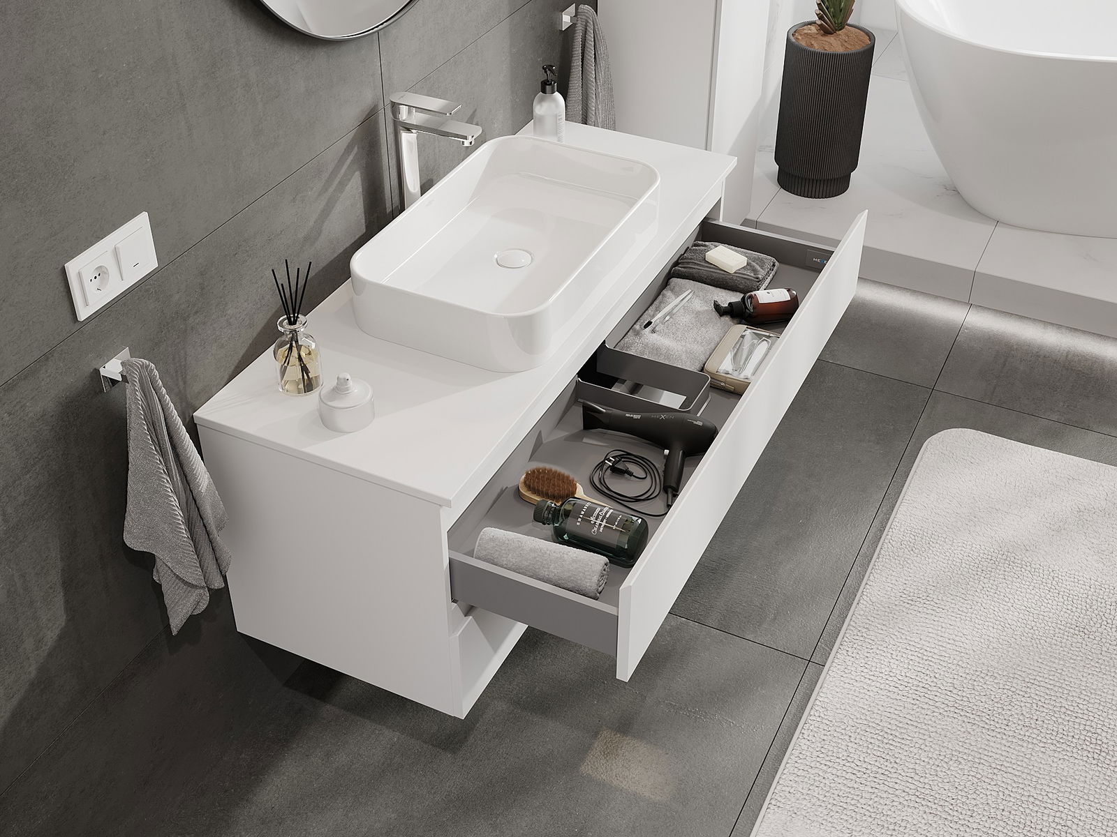 Our modular bathroom furniture can be combined in various colour configurations, allowing for complete personalisation. You can choose both the appearance and functions of individual elements, enabling you to adapt the furniture to your own stylistic and functional preferences.