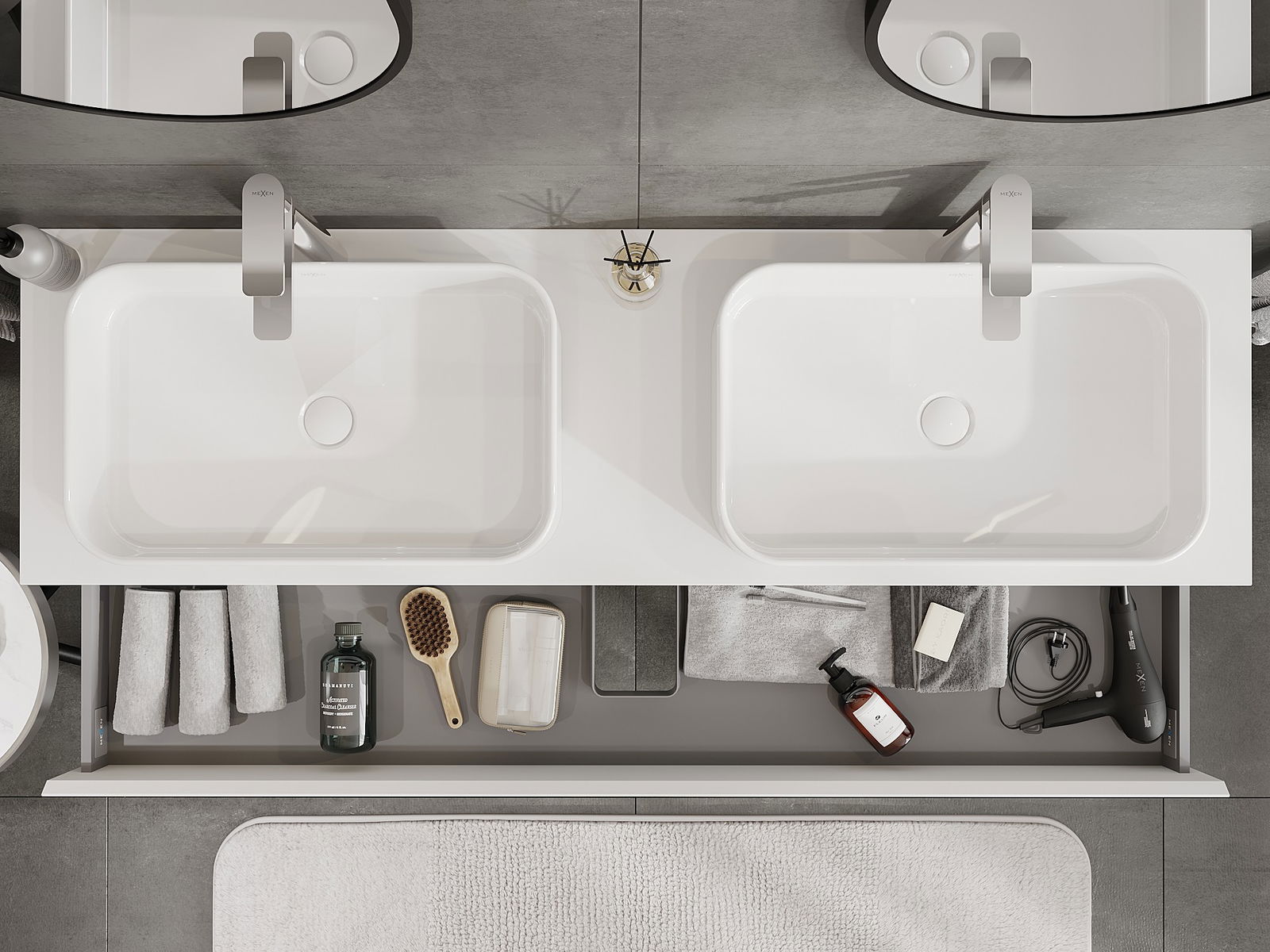 Our modular bathroom furniture can be combined in various colour configurations, allowing for complete personalisation. You can choose both the appearance and functions of individual elements, enabling you to adapt the furniture to your own stylistic and functional preferences.