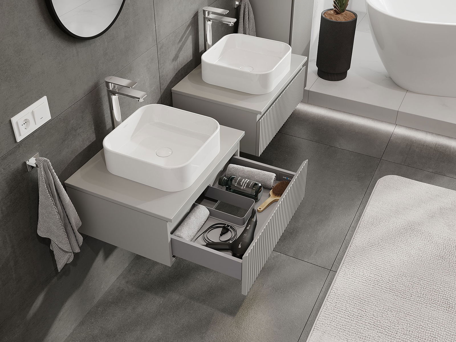 Our modular bathroom furniture can be combined in various colour configurations, allowing for complete personalisation. You can choose both the appearance and functions of individual elements, enabling you to adapt the furniture to your own stylistic and functional preferences.