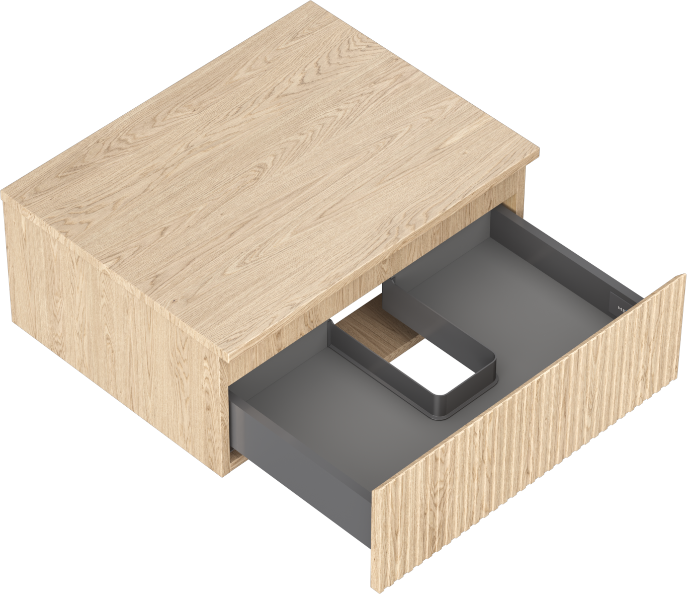 The cutout in the drawer is designed in such a way as to accommodate the siphon, which is essential in sink installations. This allows the furniture to be fully functional without having to give up drawer space for the installation.