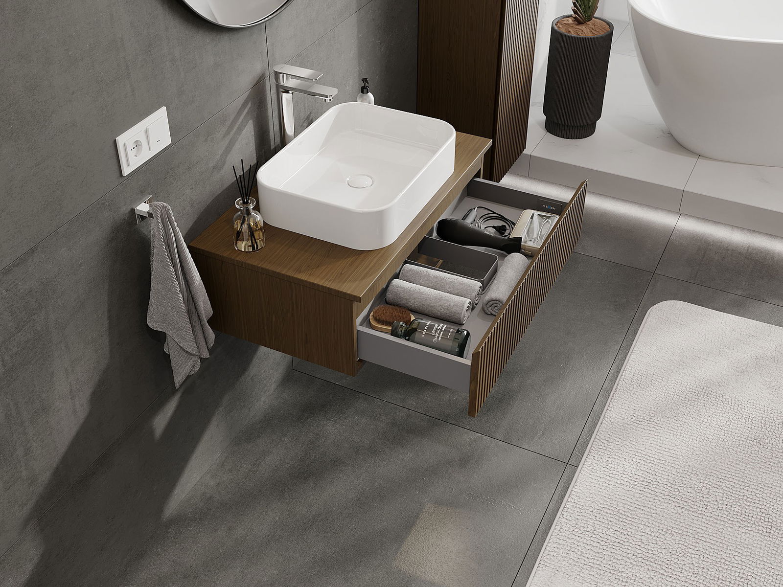 Our modular bathroom furniture can be combined in various colour configurations, allowing for complete personalisation. You can choose both the appearance and functions of individual elements, enabling you to adapt the furniture to your own stylistic and functional preferences.