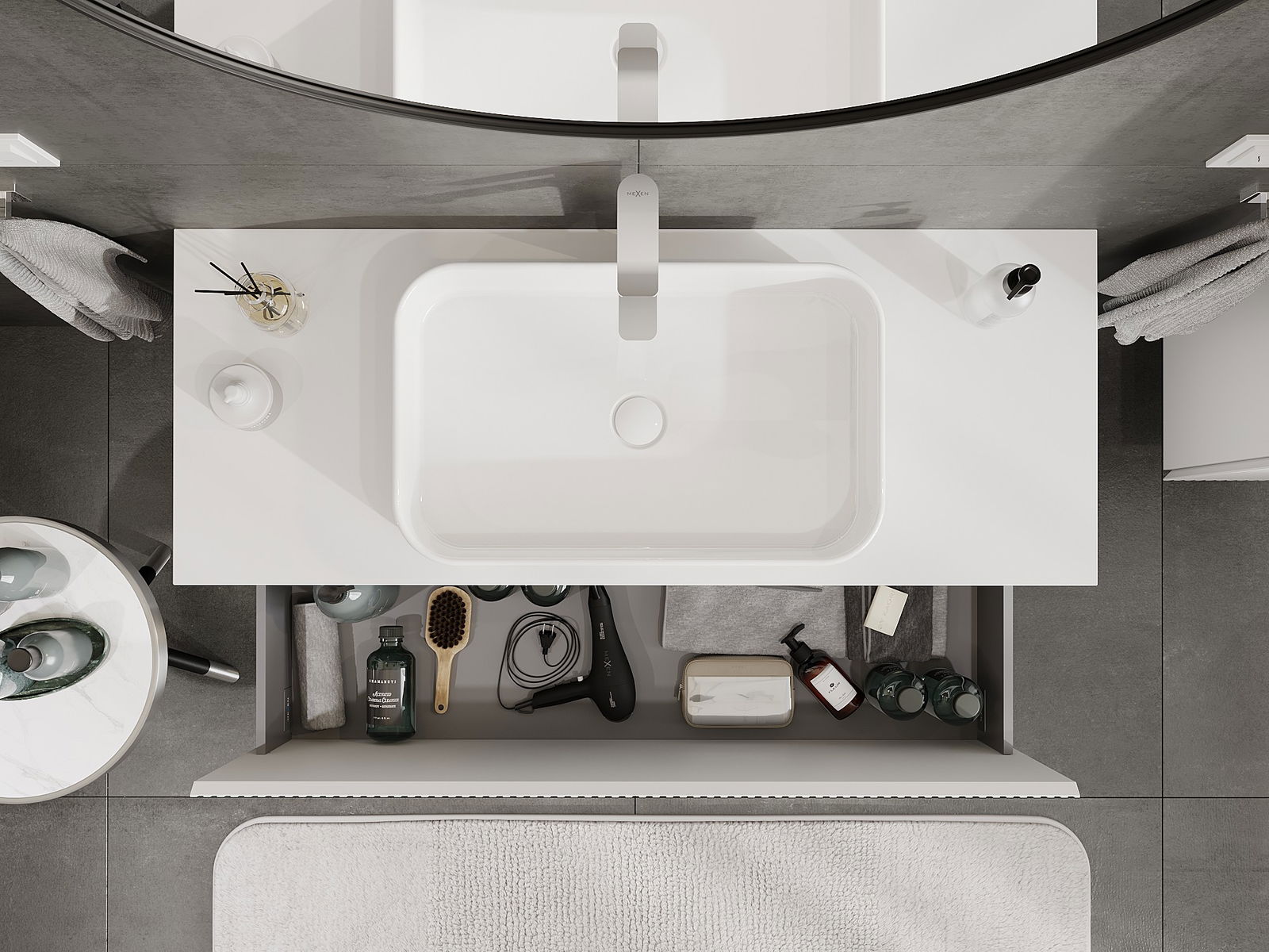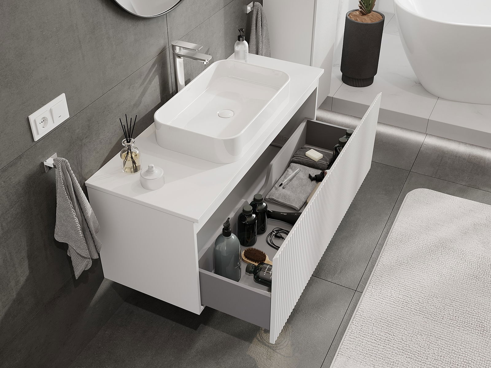Our modular bathroom furniture can be combined in various colour configurations, allowing for complete personalisation. You can choose both the appearance and functions of individual elements, enabling you to adapt the furniture to your own stylistic and functional preferences.