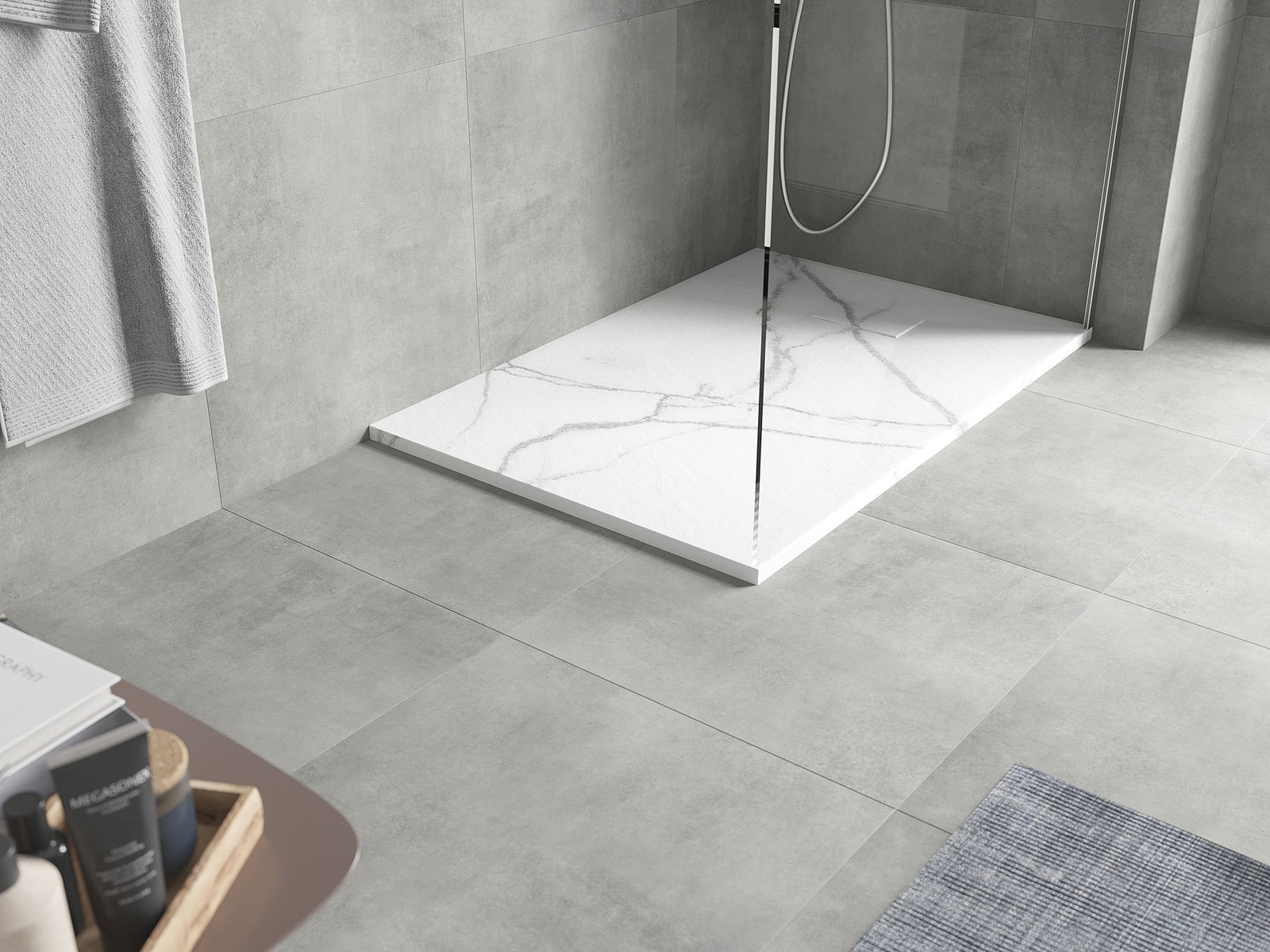 The surface of the shower tray resembles stone in its structure. It is a unique combination of a natural appearance with modern interior design. It adds character, enhances the aesthetics and elegance of the bathroom decor, and delights with its form.