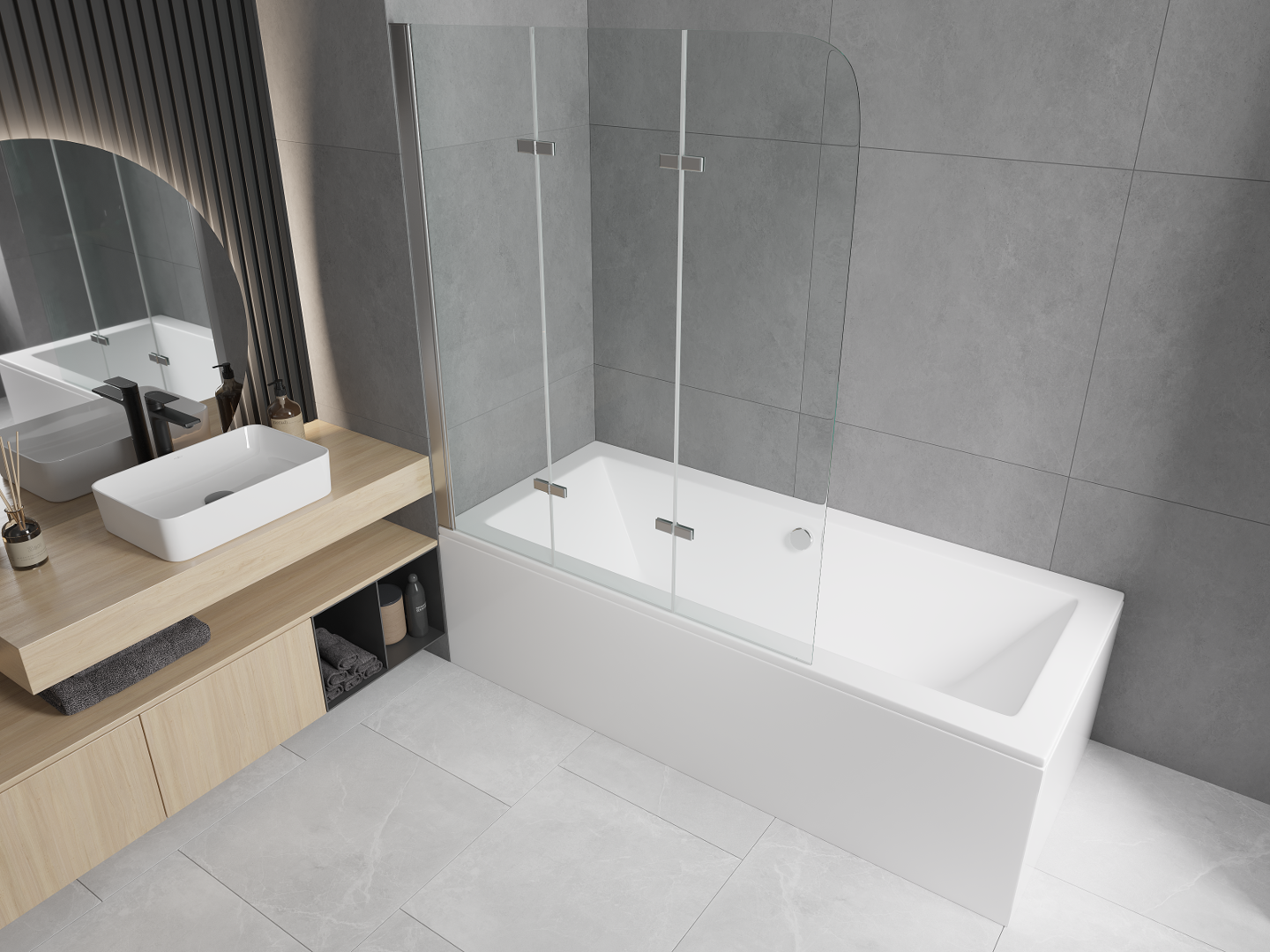 E Parawan aus dräi Flille mam Méi sou datt en zesummegeklappt ka ginn. Dës Léisung erlaabt et méi Plaz am Buedzëmmer ze spueren an erméiglecht et fräi d'Reschtraum ze benotzen wann d'Badzone net benotzt gëtt.