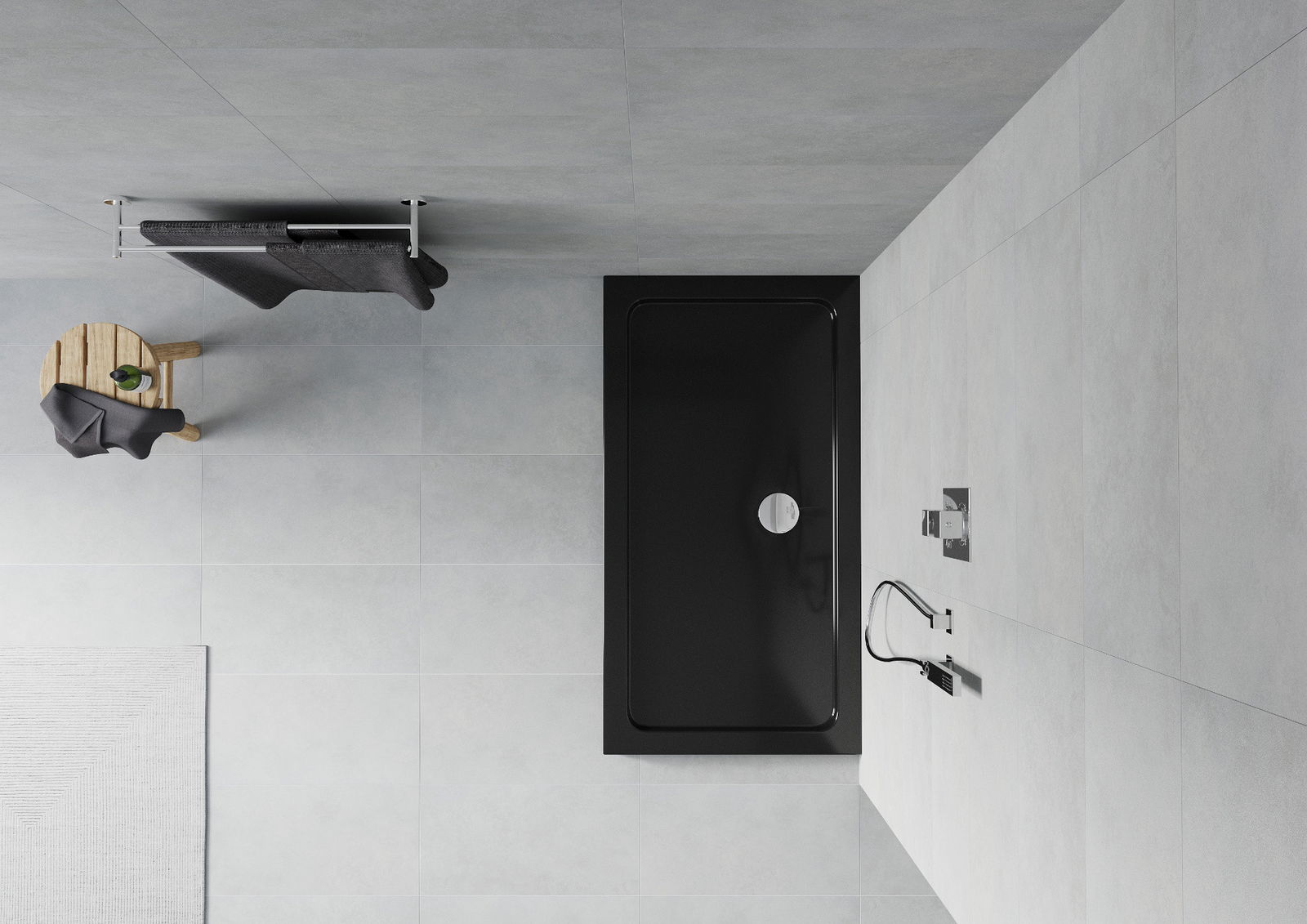 Den Douchebueden ass esou entwéckelt, datt d'Waasser fräi an d'Richtung vum Oflaaf kann oflafen. Et garantéiert en schnellen an effizienten Ofleedung vum Waasser vun der Uewerfläch vum Douchebued, fir d'Entstoe vu Pätz a Läcken an der Buedzëmmer ze vermeiden.