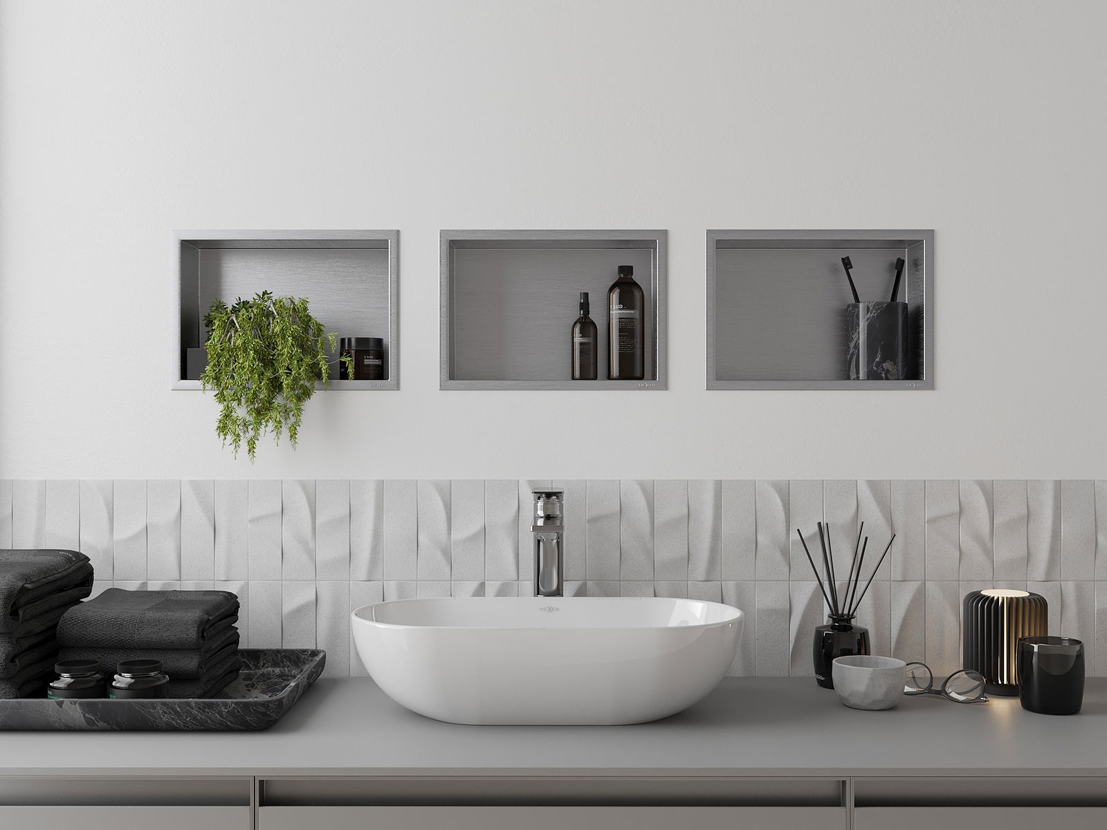 Méiglechkeet fir an der Mauer oder an enger speziell vorbereiten Déposée ze montéieren. Et ass eng extrem modern an funktionell Léisung, déi Plaz spuere léisst an de Produit un d'Esthetik vun den Interieur upassen an eng zesummegepasst Kompositioun schafen.