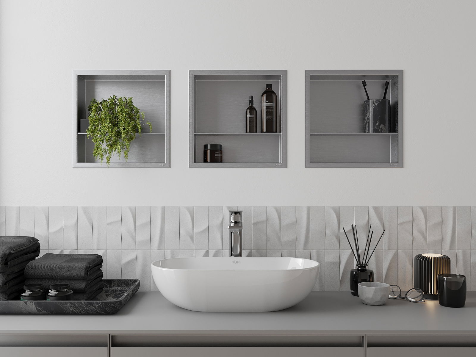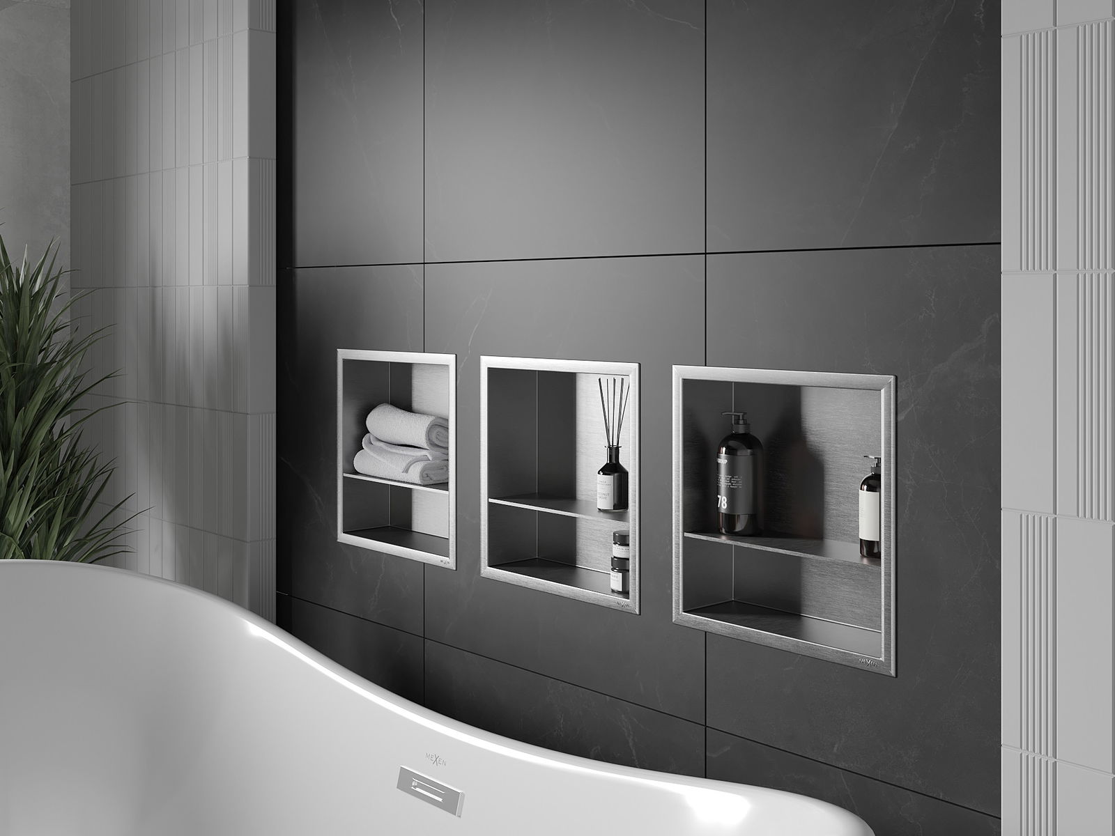 Méiglechkeet fir an der Mauer oder an enger speziell vorbereiten Déposée ze montéieren. Et ass eng extrem modern an funktionell Léisung, déi Plaz spuere léisst an de Produit un d'Esthetik vun den Interieur upassen an eng zesummegepasst Kompositioun schafen.