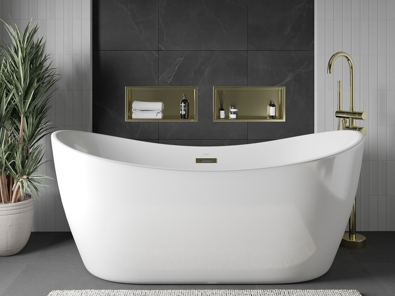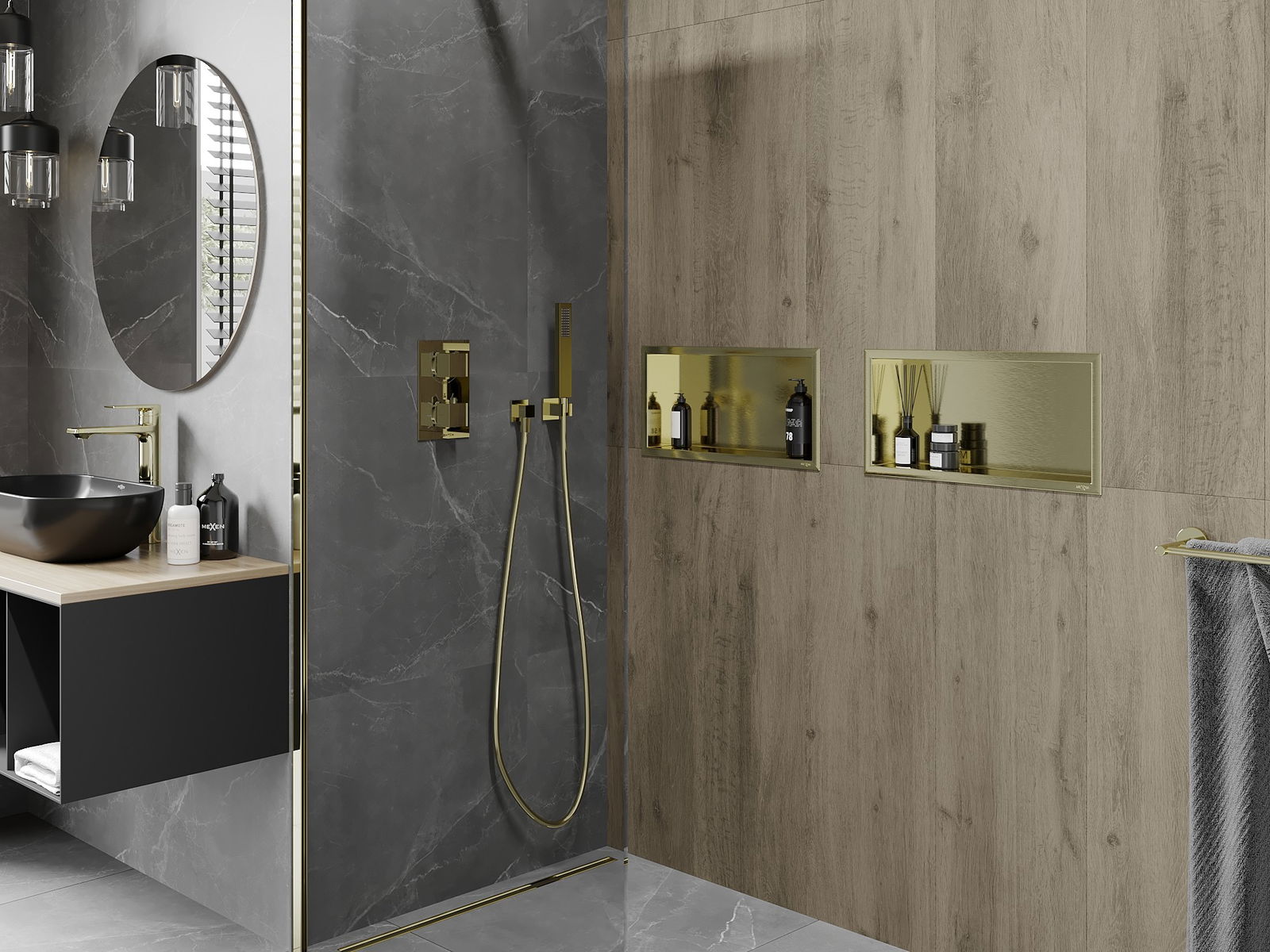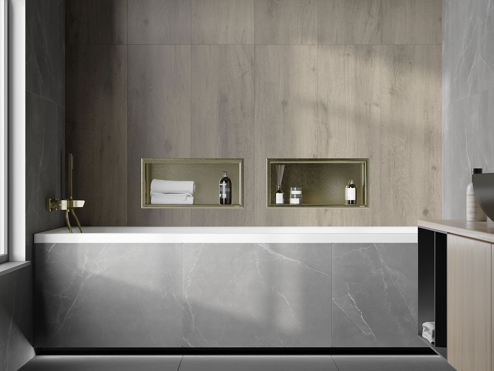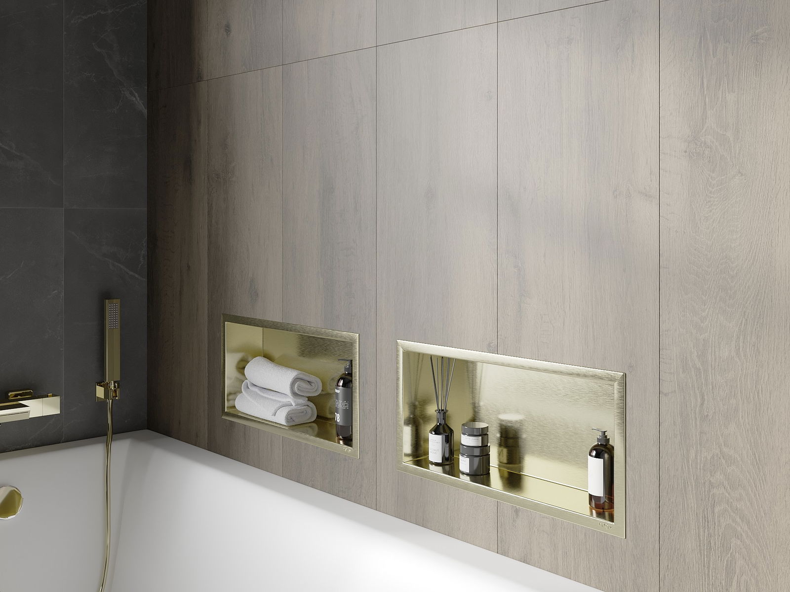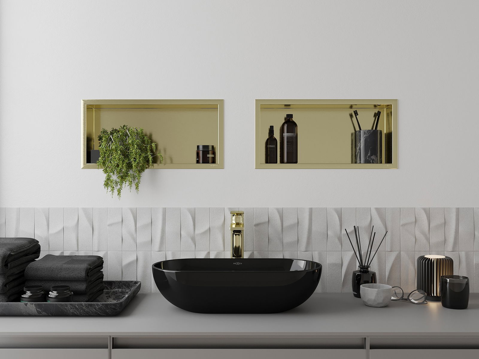 Méiglechkeet fir an der Mauer oder an enger speziell vorbereiten Déposée ze montéieren. Et ass eng extrem modern an funktionell Léisung, déi Plaz spuere léisst an de Produit un d'Esthetik vun den Interieur upassen an eng zesummegepasst Kompositioun schafen.