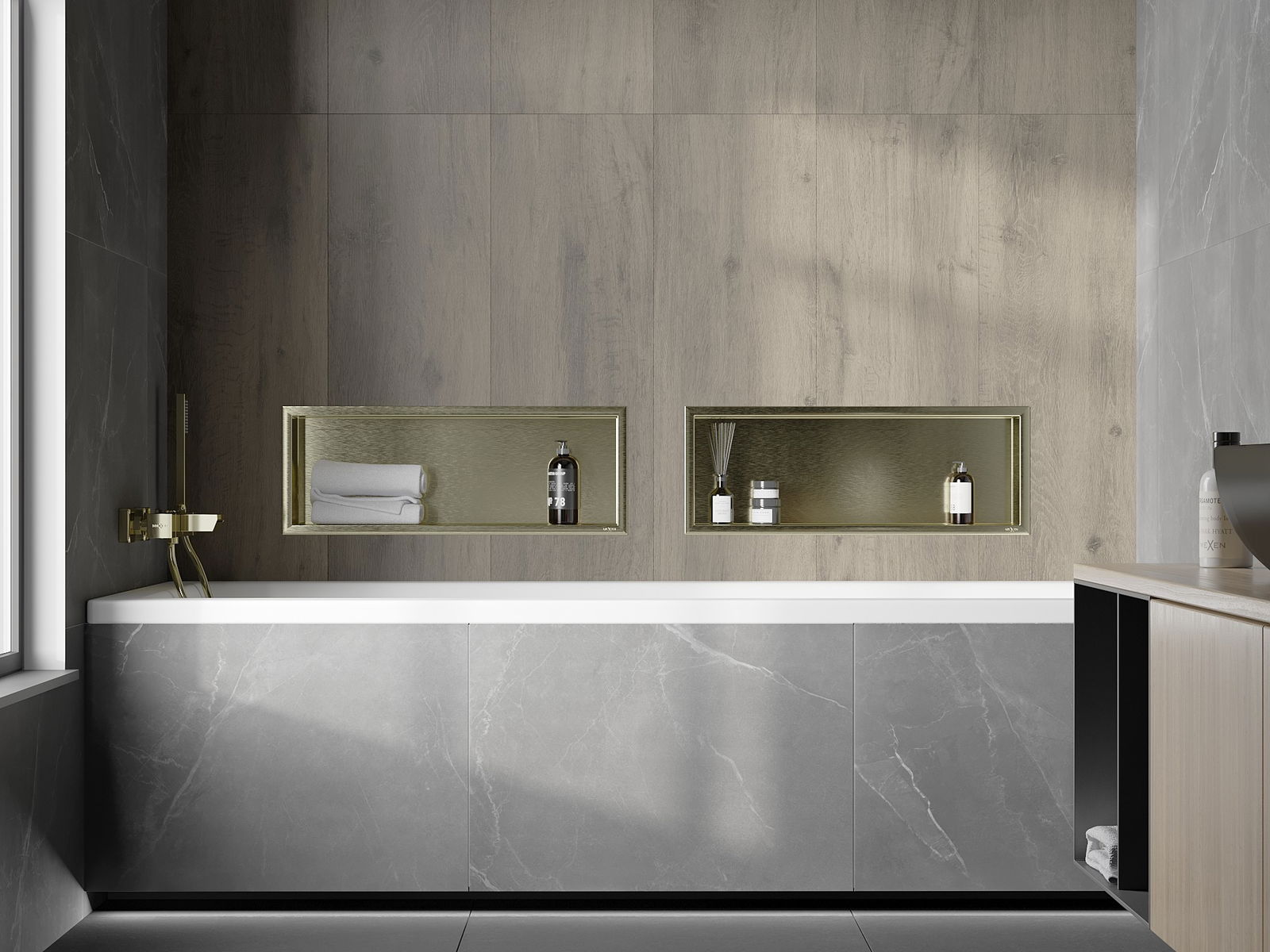 Méiglechkeet fir an der Mauer oder an enger speziell vorbereiten Déposée ze montéieren. Et ass eng extrem modern an funktionell Léisung, déi Plaz spuere léisst an de Produit un d'Esthetik vun den Interieur upassen an eng zesummegepasst Kompositioun schafen.