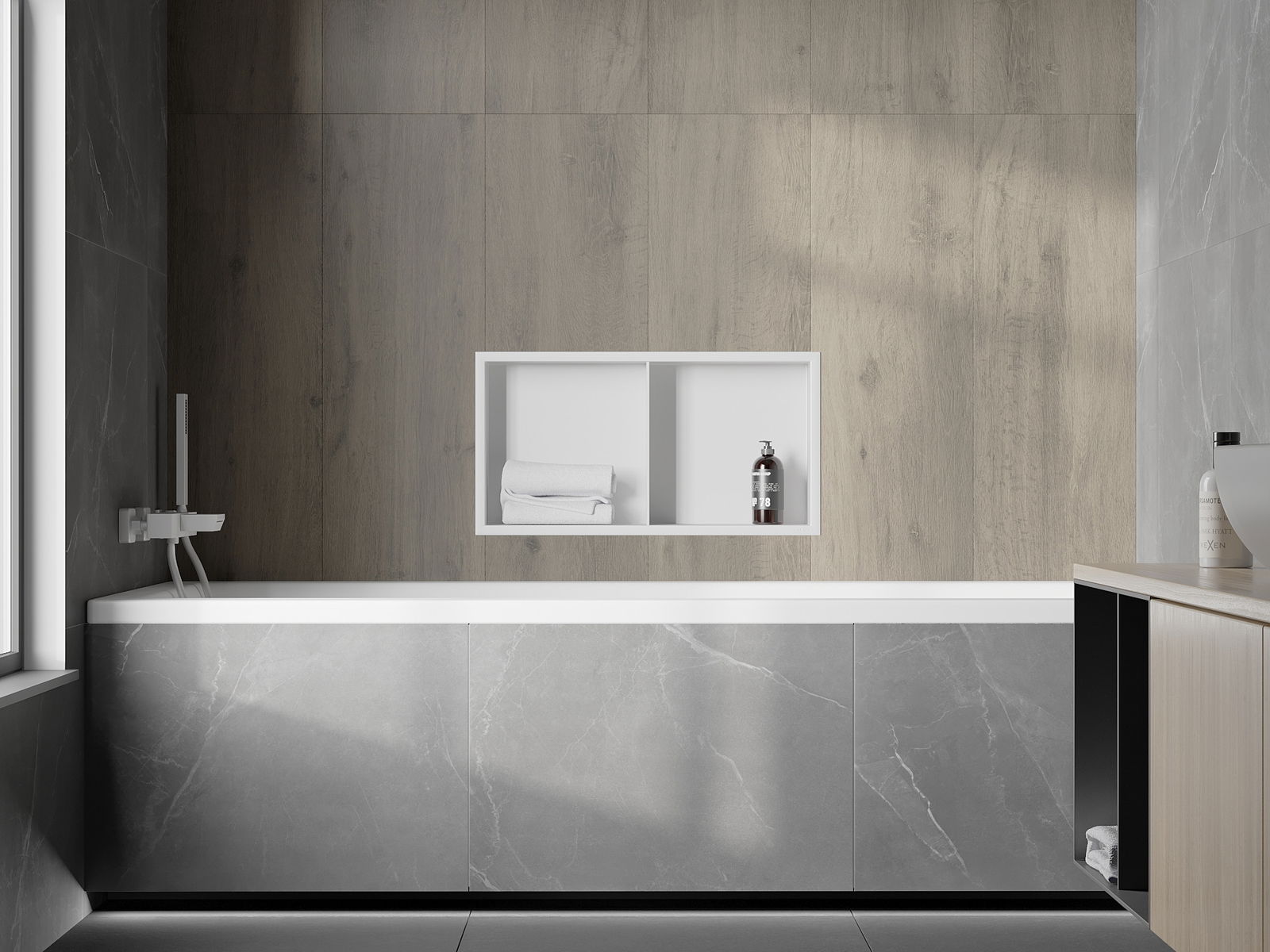 Méiglechkeet fir an der Mauer oder an enger speziell vorbereiten Déposée ze montéieren. Et ass eng extrem modern an funktionell Léisung, déi Plaz spuere léisst an de Produit un d'Esthetik vun den Interieur upassen an eng zesummegepasst Kompositioun schafen.