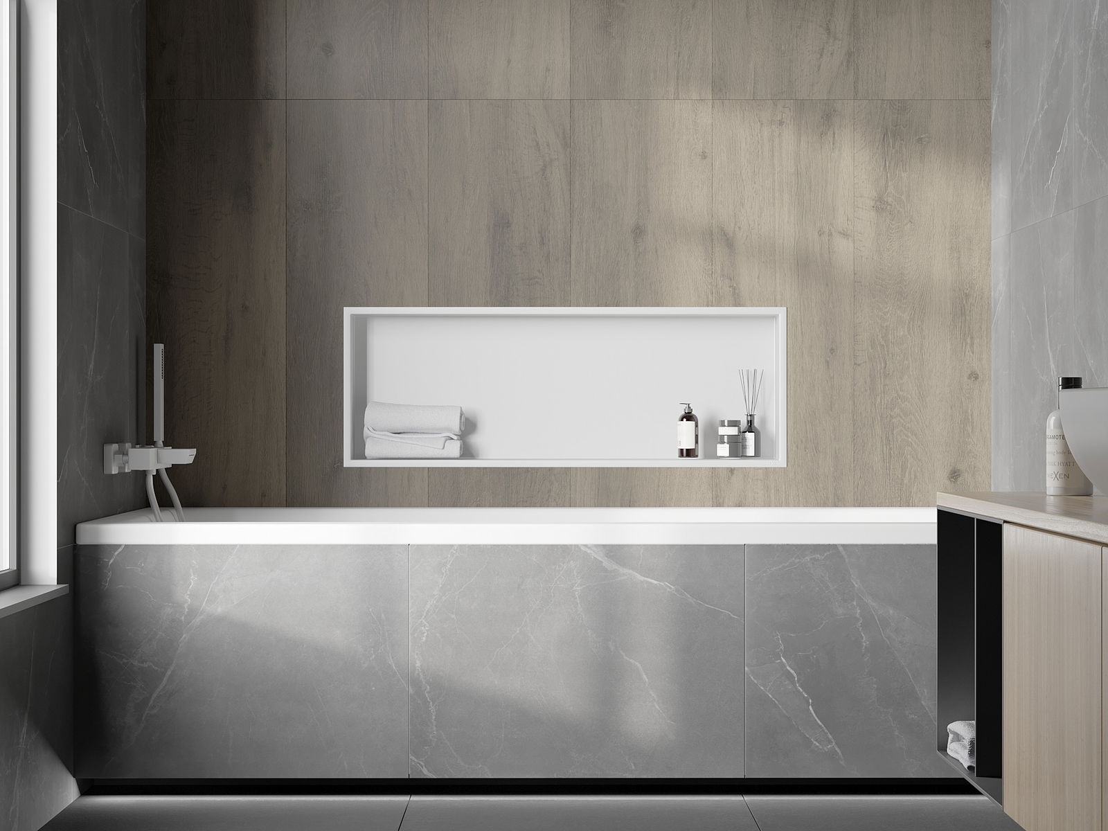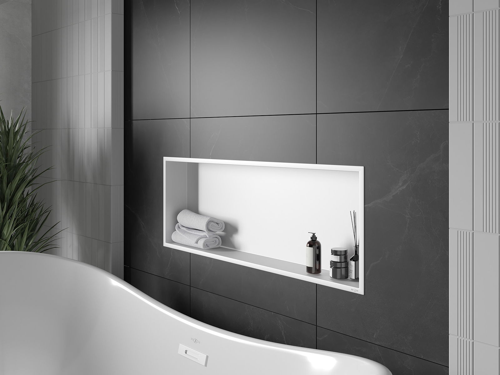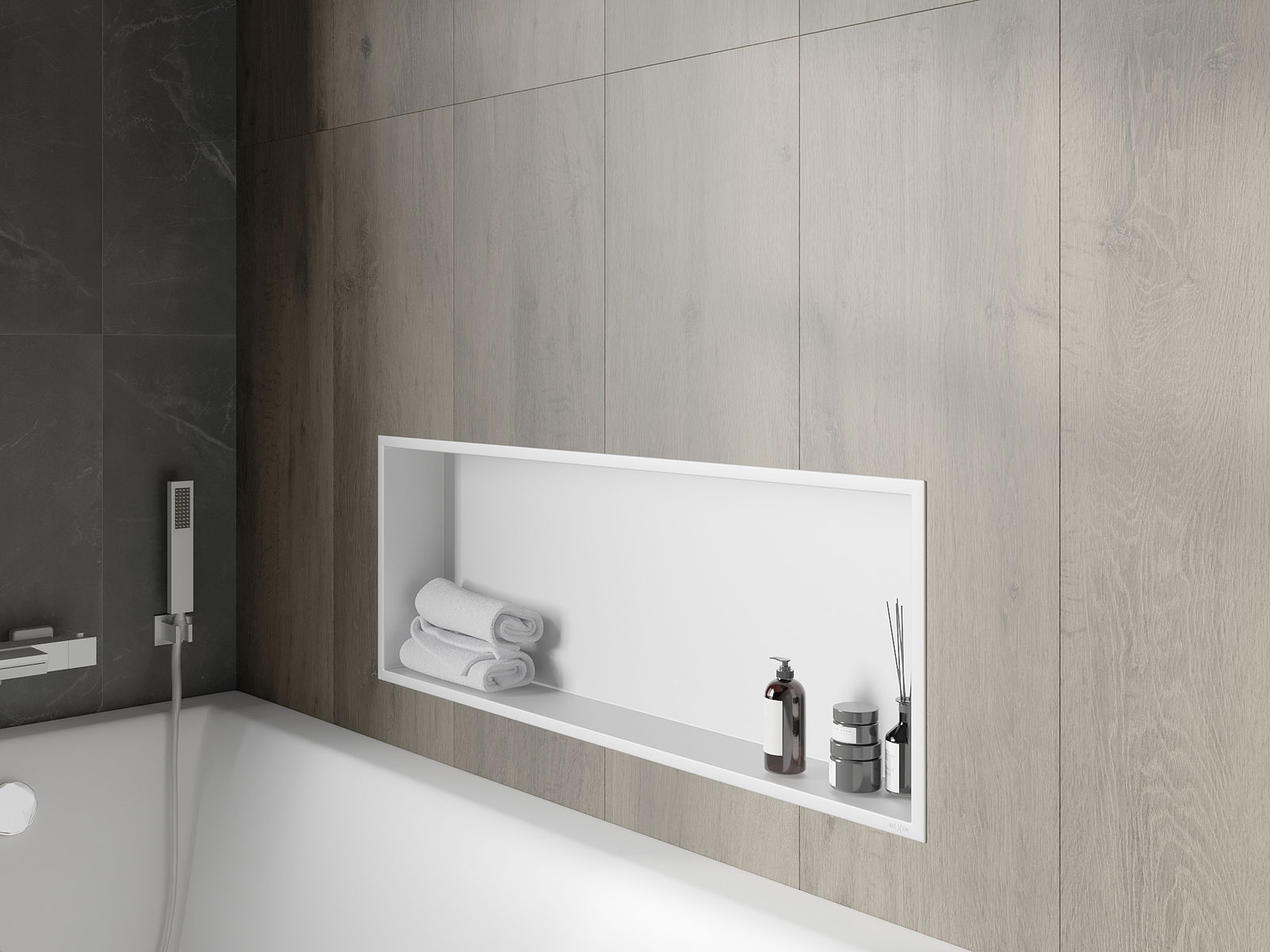 Méiglechkeet fir an der Mauer oder an enger speziell vorbereiten Déposée ze montéieren. Et ass eng extrem modern an funktionell Léisung, déi Plaz spuere léisst an de Produit un d'Esthetik vun den Interieur upassen an eng zesummegepasst Kompositioun schafen.