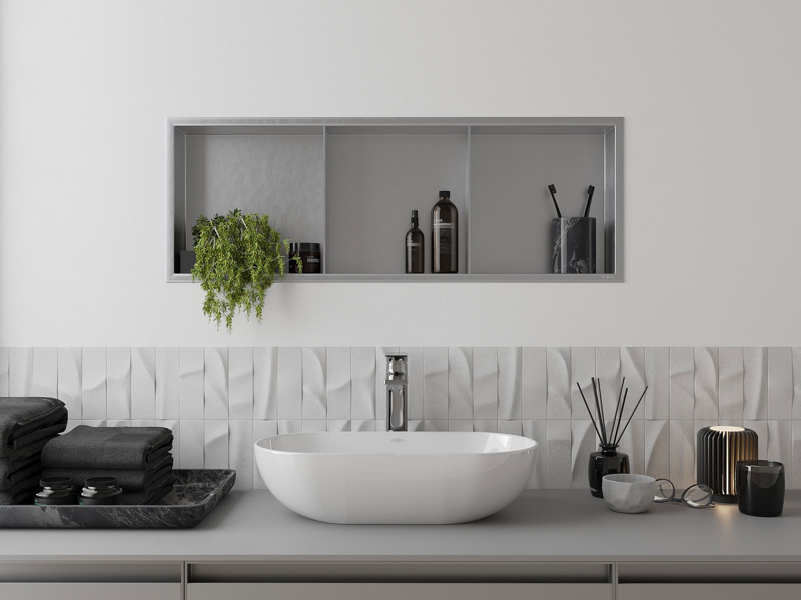 Méiglechkeet fir an der Mauer oder an enger speziell vorbereiten Déposée ze montéieren. Et ass eng extrem modern an funktionell Léisung, déi Plaz spuere léisst an de Produit un d'Esthetik vun den Interieur upassen an eng zesummegepasst Kompositioun schafen.