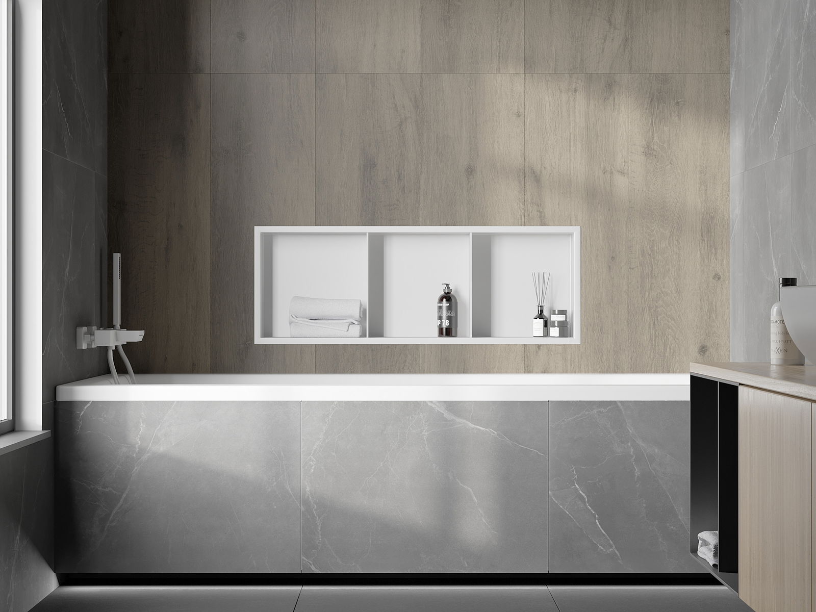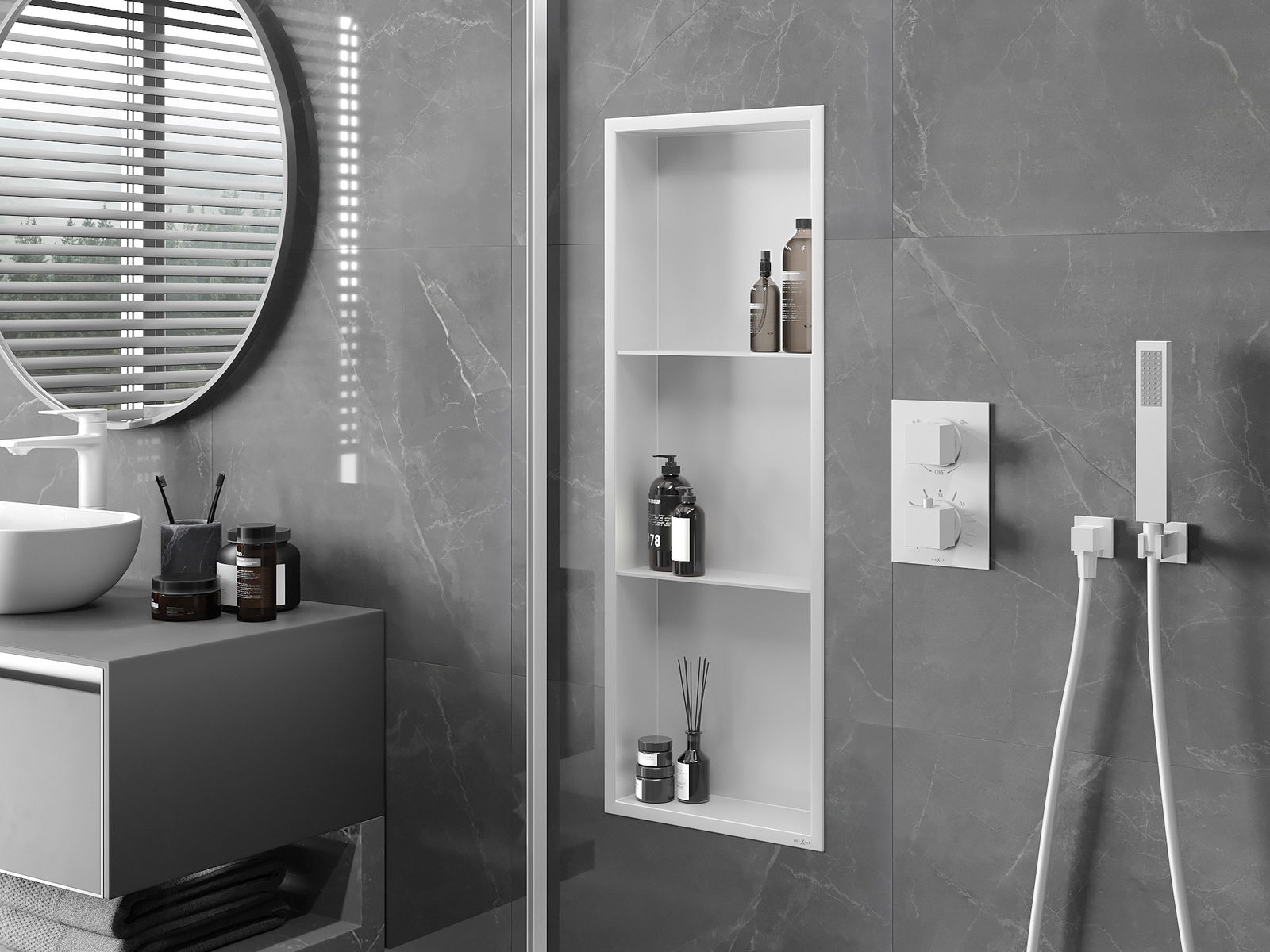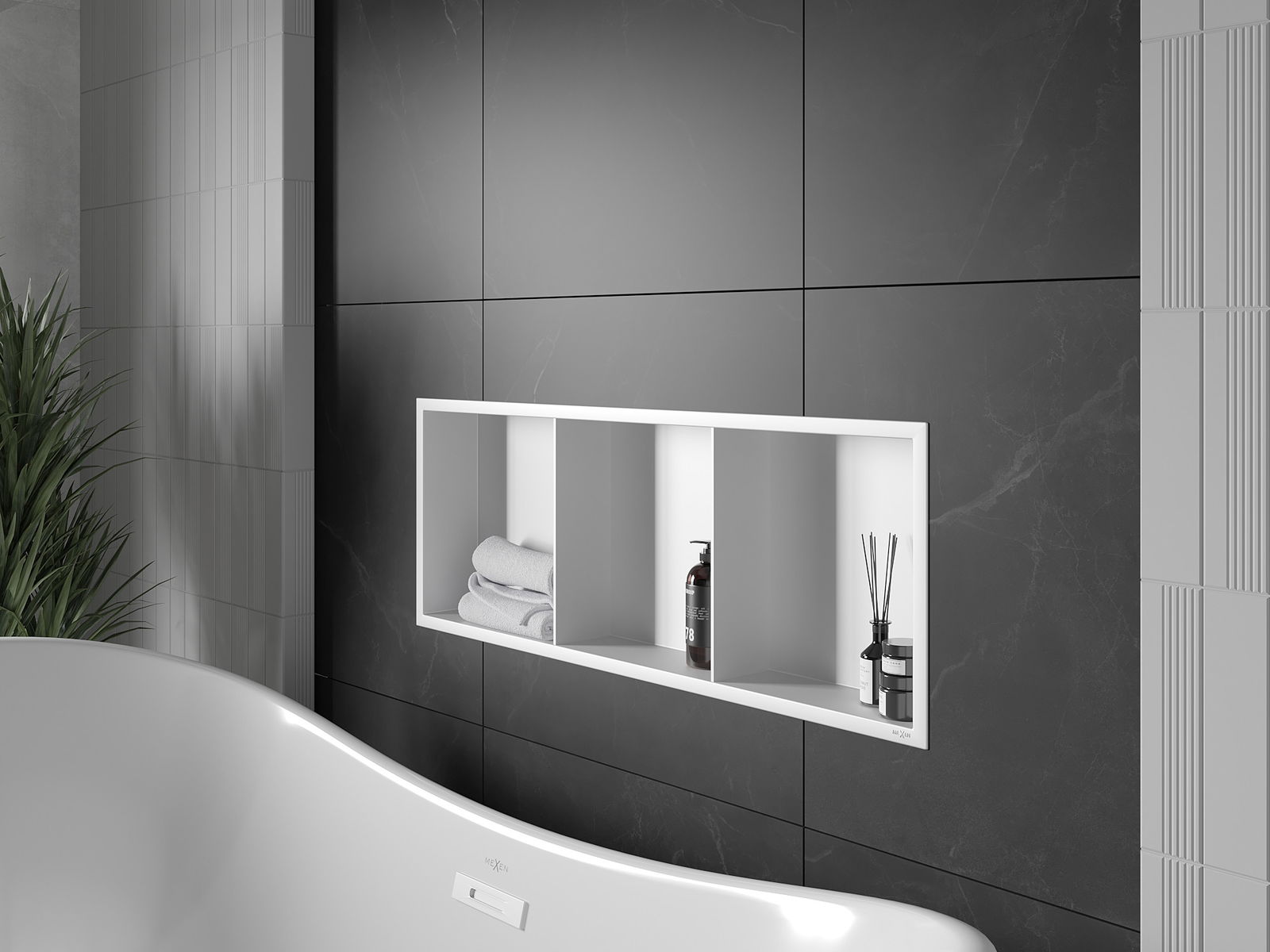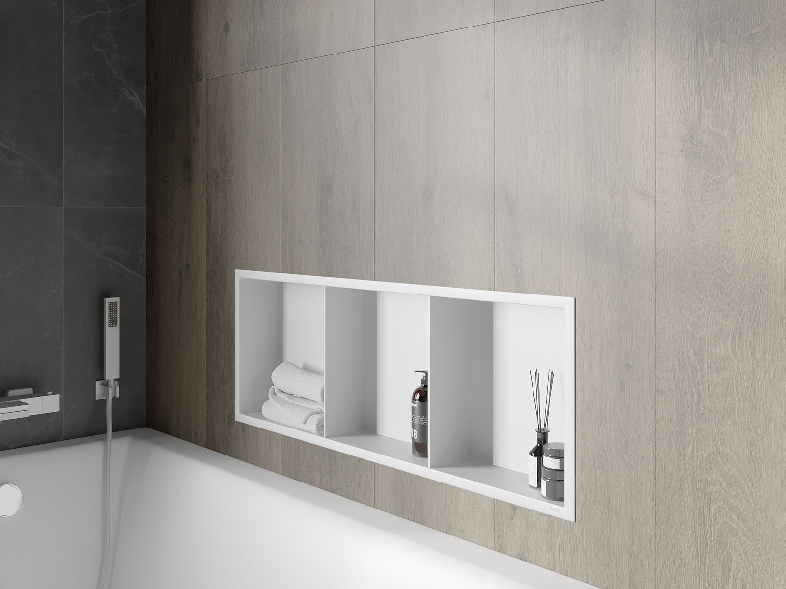 Méiglechkeet fir an der Mauer oder an enger speziell vorbereiten Déposée ze montéieren. Et ass eng extrem modern an funktionell Léisung, déi Plaz spuere léisst an de Produit un d'Esthetik vun den Interieur upassen an eng zesummegepasst Kompositioun schafen.