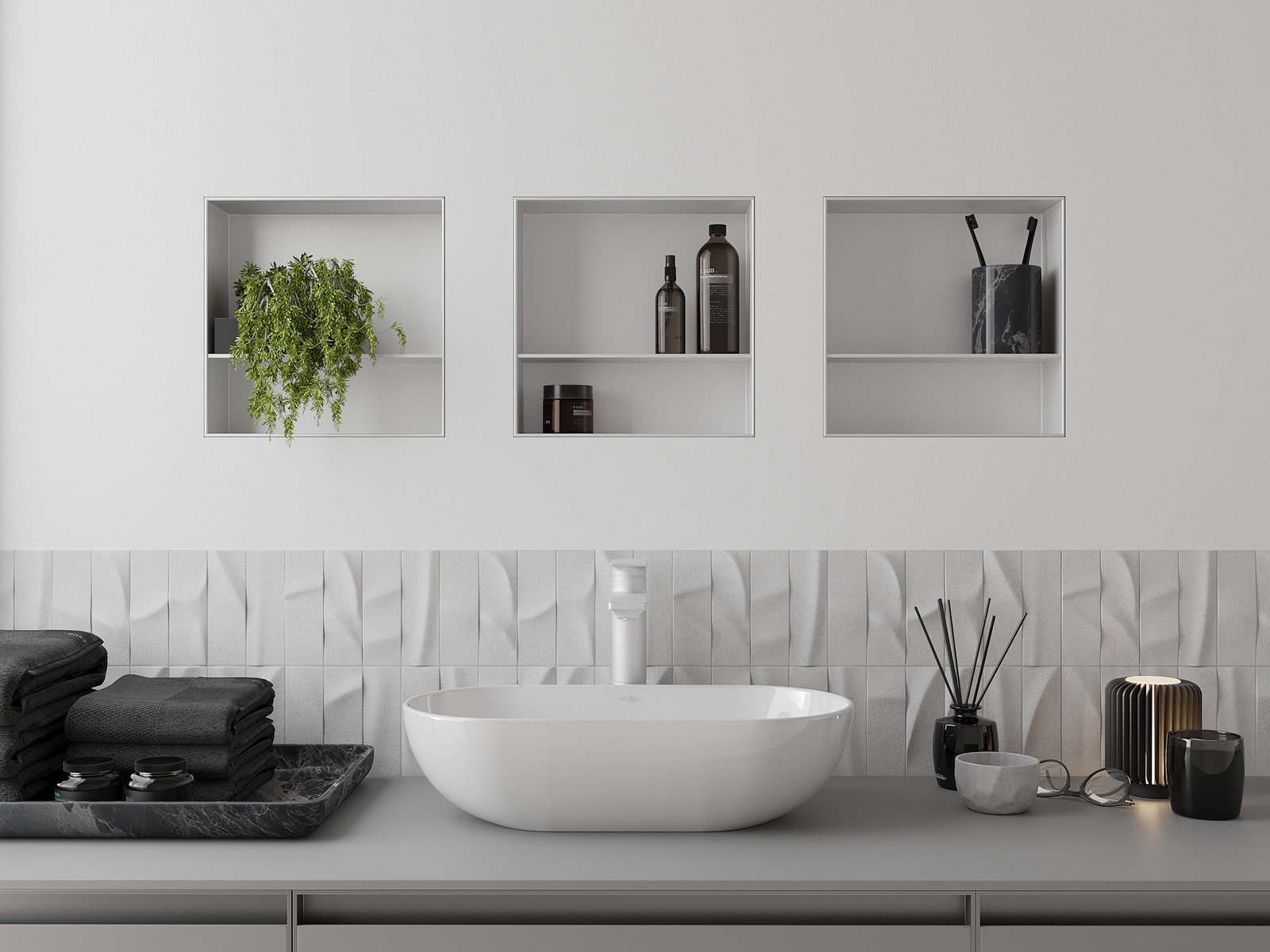 Méiglechkeet fir an der Mauer oder an enger speziell vorbereiten Déposée ze montéieren. Et ass eng extrem modern an funktionell Léisung, déi Plaz spuere léisst an de Produit un d'Esthetik vun den Interieur upassen an eng zesummegepasst Kompositioun schafen.