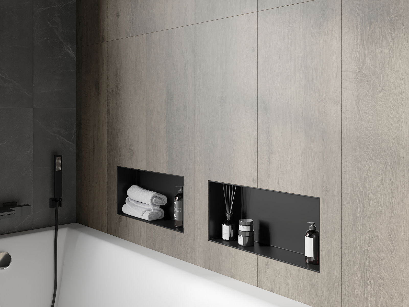 Méiglechkeet fir an der Mauer oder an enger speziell vorbereiten Déposée ze montéieren. Et ass eng extrem modern an funktionell Léisung, déi Plaz spuere léisst an de Produit un d'Esthetik vun den Interieur upassen an eng zesummegepasst Kompositioun schafen.