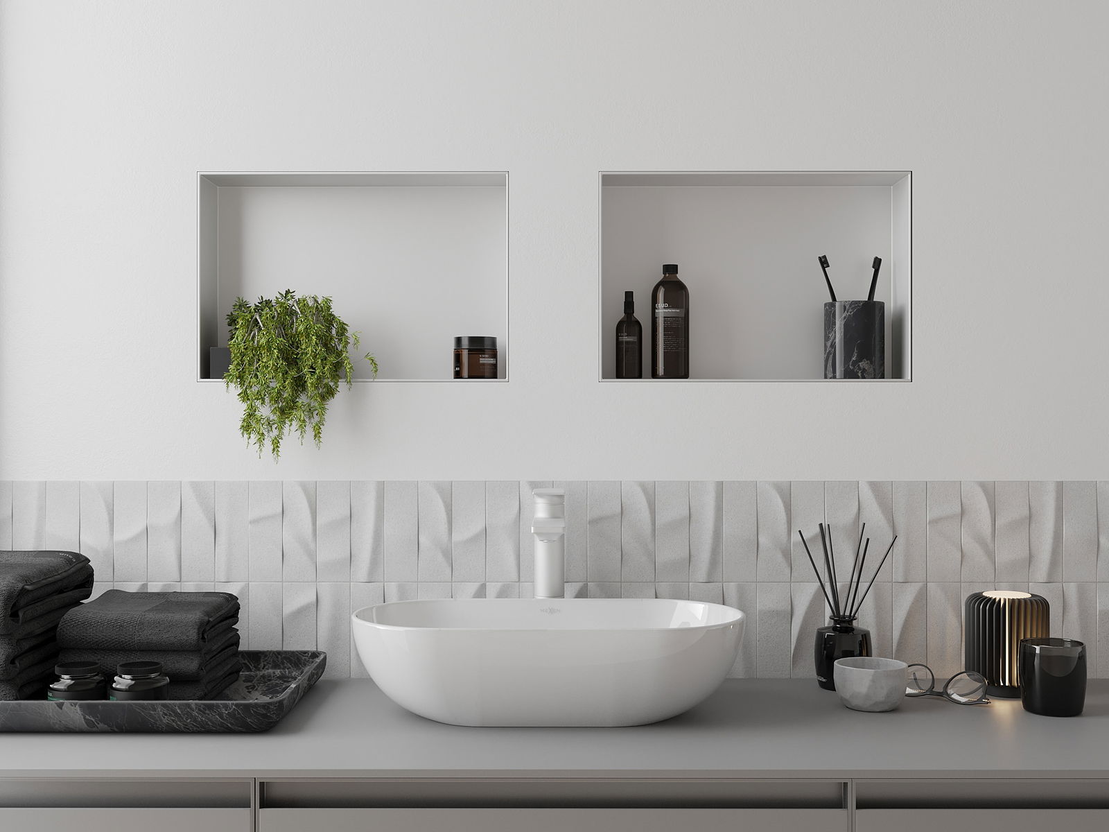 Méiglechkeet fir an der Mauer oder an enger speziell vorbereiten Déposée ze montéieren. Et ass eng extrem modern an funktionell Léisung, déi Plaz spuere léisst an de Produit un d'Esthetik vun den Interieur upassen an eng zesummegepasst Kompositioun schafen.