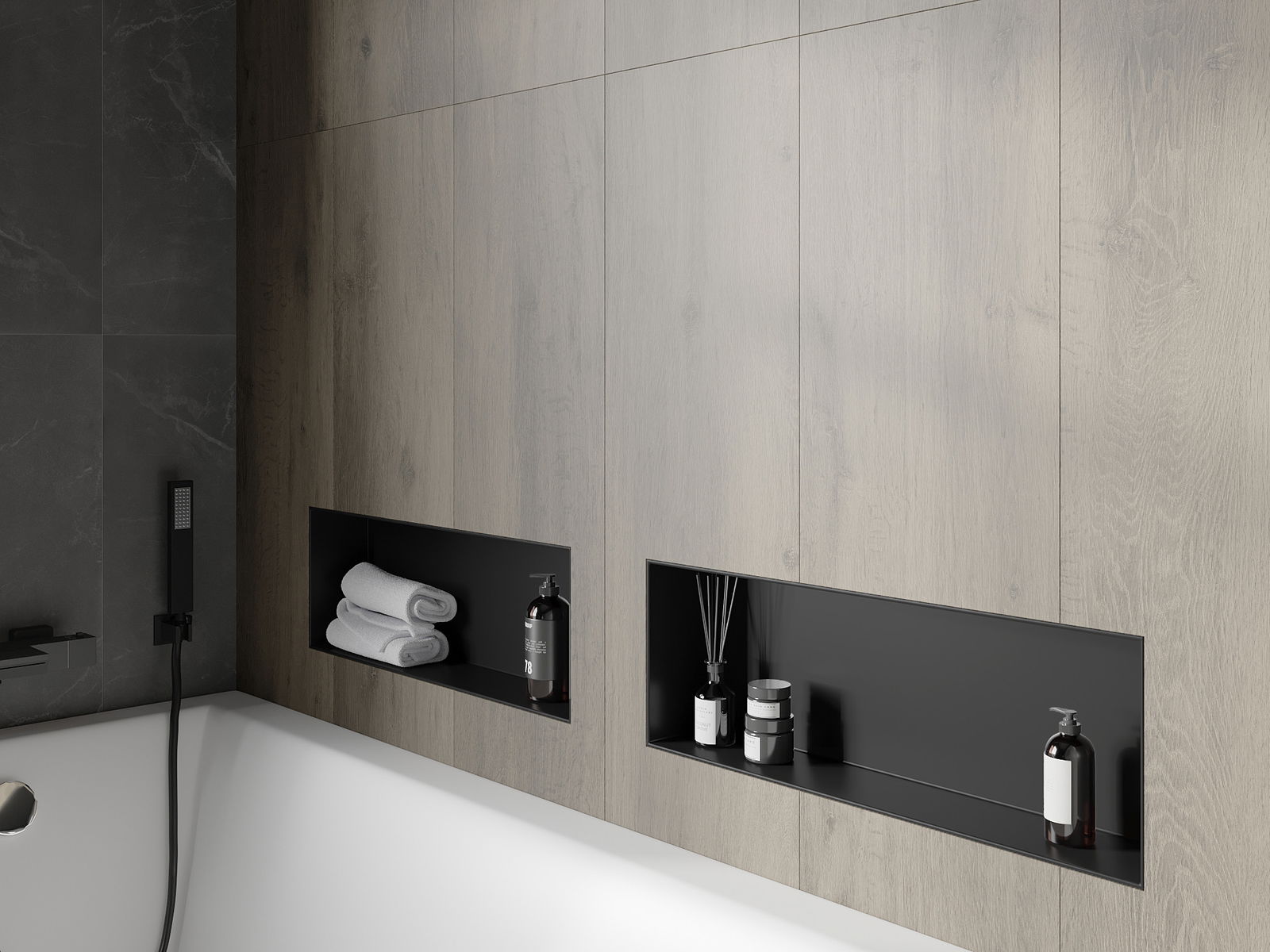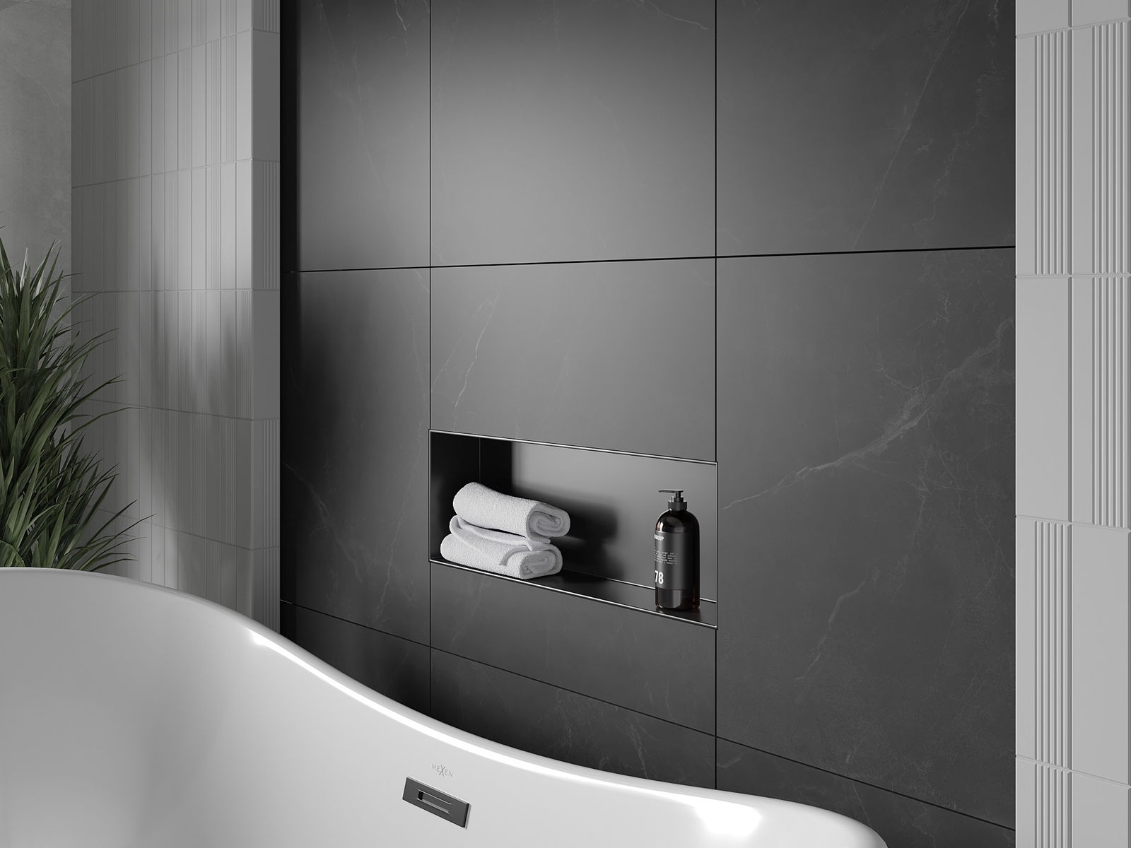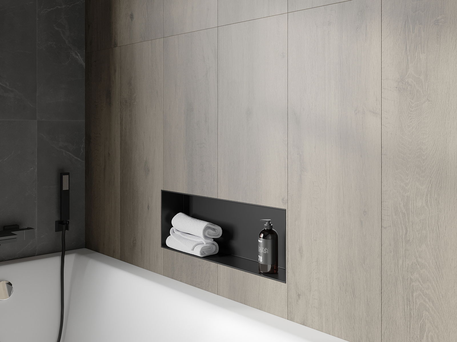 Méiglechkeet fir an der Mauer oder an enger speziell vorbereiten Déposée ze montéieren. Et ass eng extrem modern an funktionell Léisung, déi Plaz spuere léisst an de Produit un d'Esthetik vun den Interieur upassen an eng zesummegepasst Kompositioun schafen.