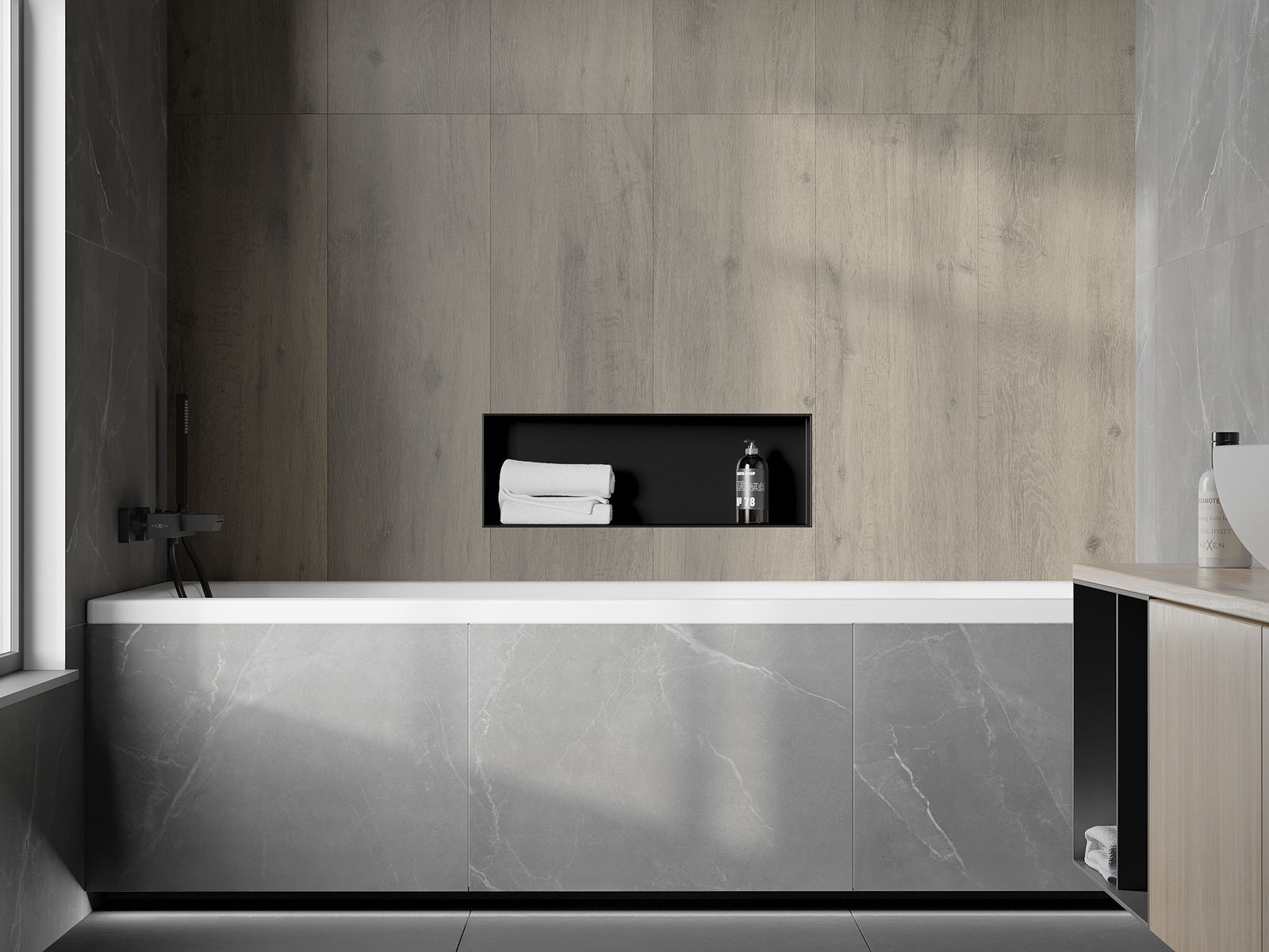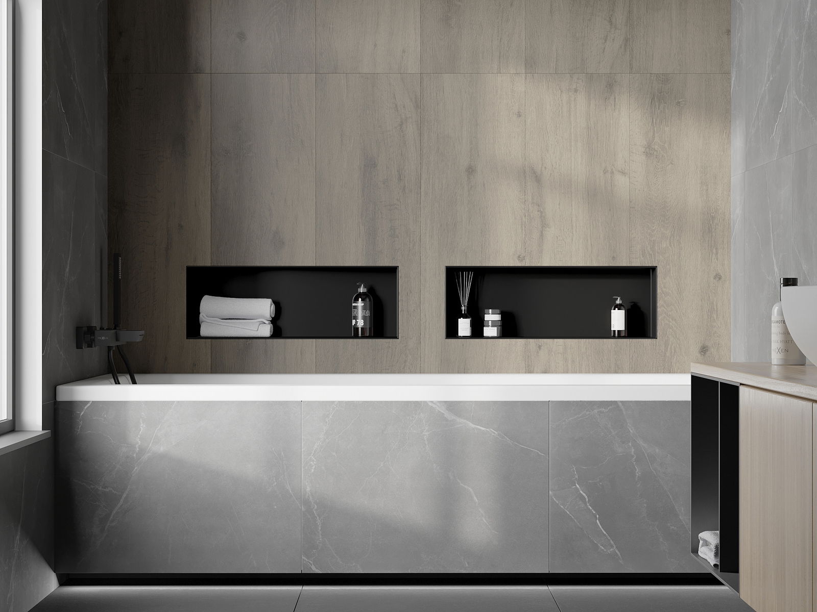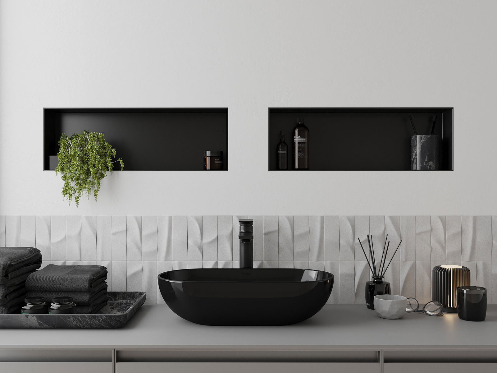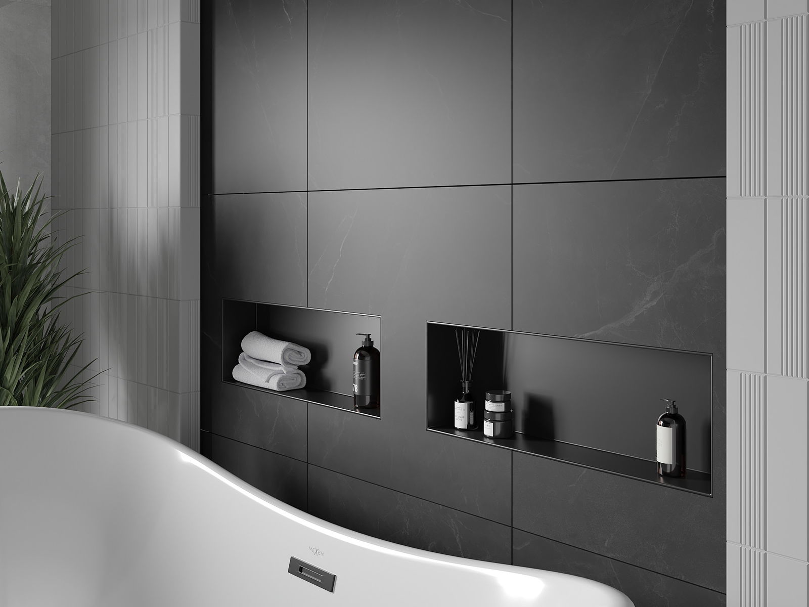 Méiglechkeet fir an der Mauer oder an enger speziell vorbereiten Déposée ze montéieren. Et ass eng extrem modern an funktionell Léisung, déi Plaz spuere léisst an de Produit un d'Esthetik vun den Interieur upassen an eng zesummegepasst Kompositioun schafen.
