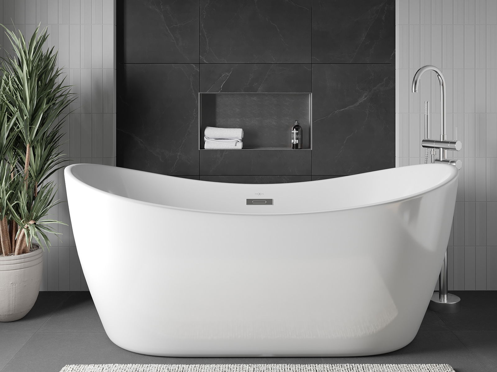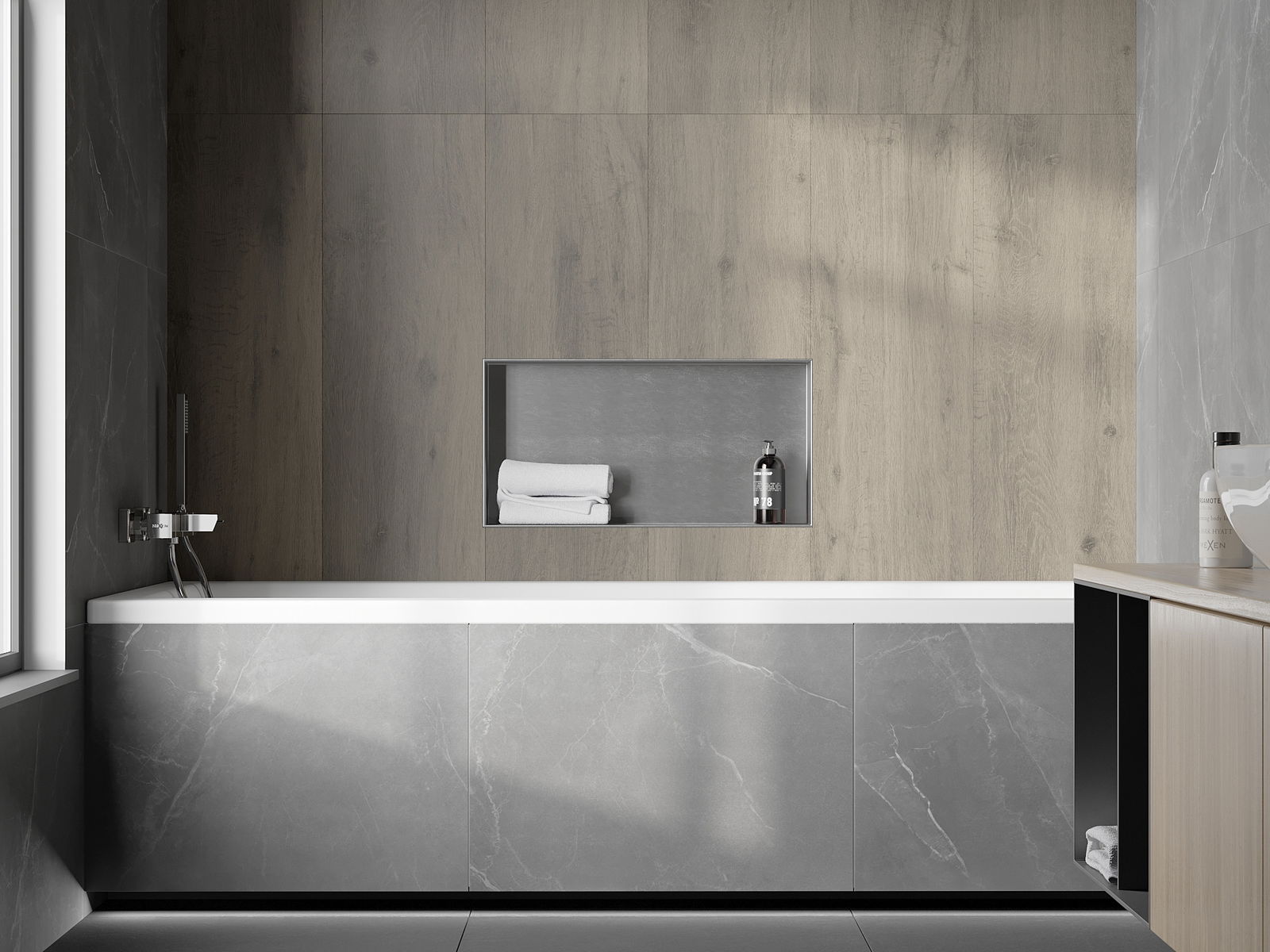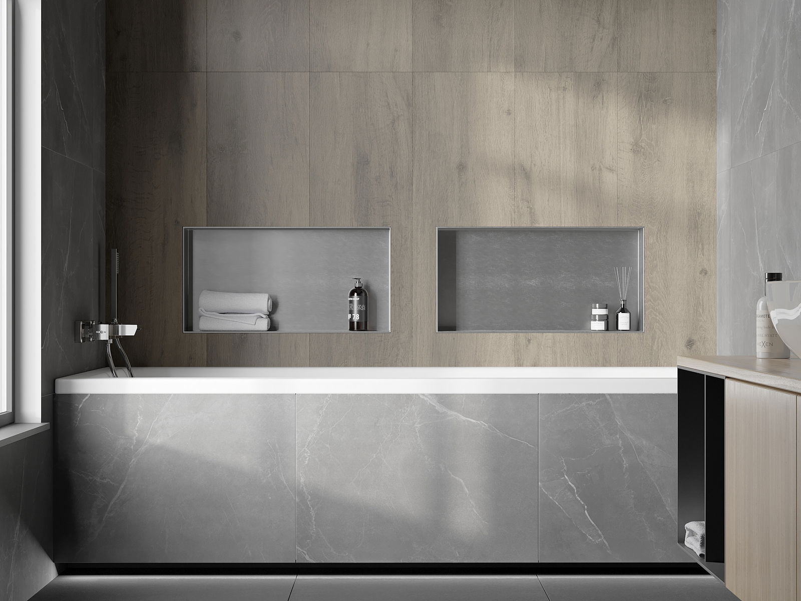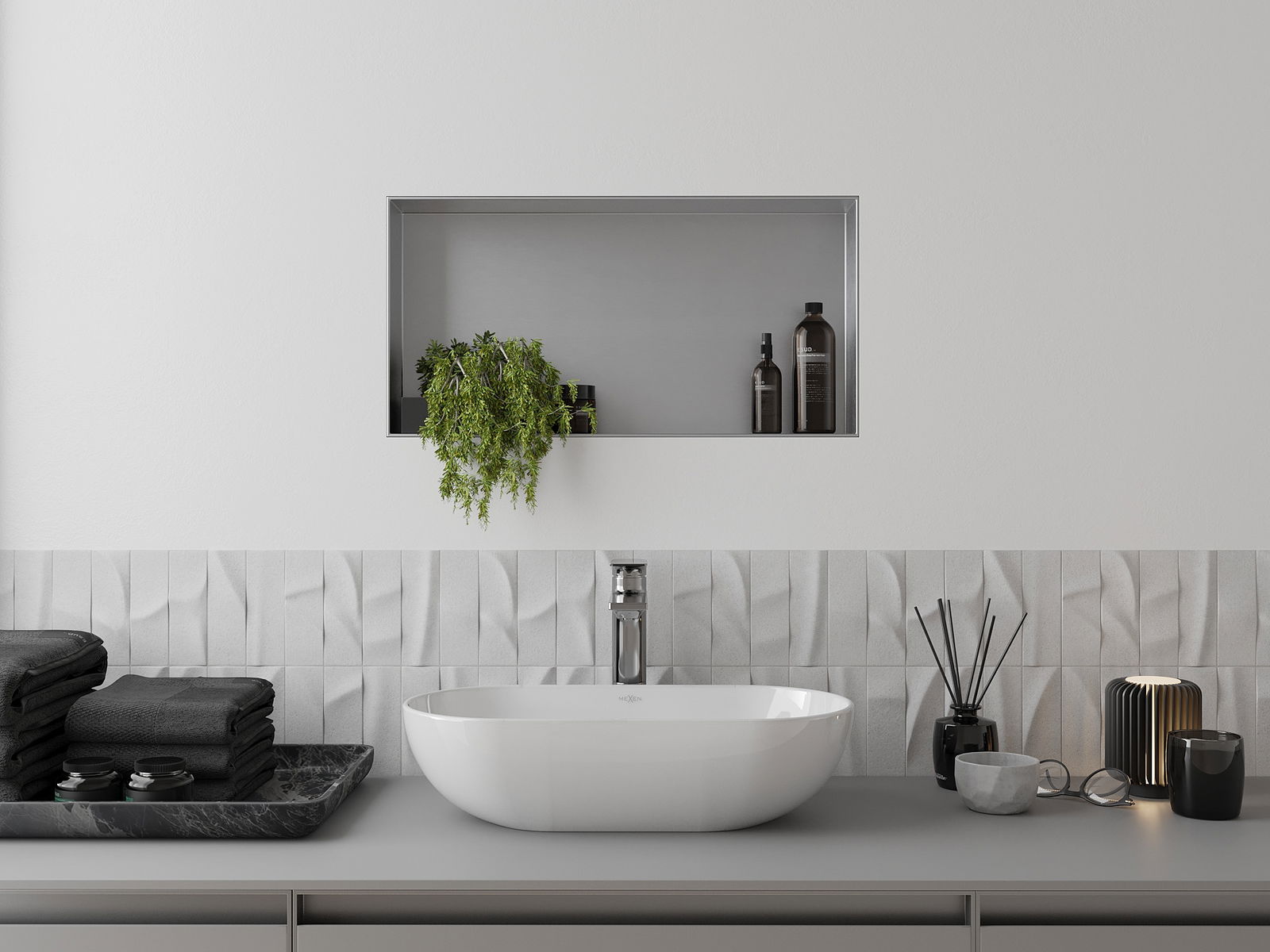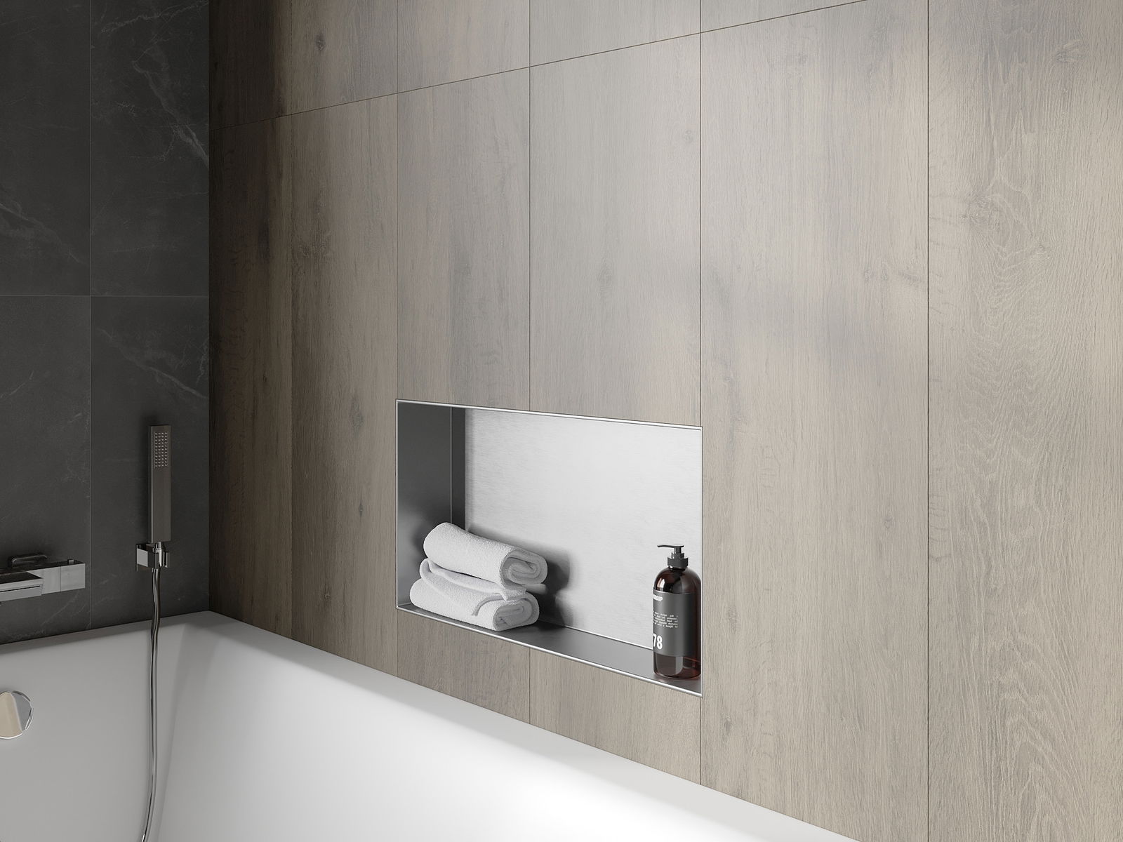 Méiglechkeet fir an der Mauer oder an enger speziell vorbereiten Déposée ze montéieren. Et ass eng extrem modern an funktionell Léisung, déi Plaz spuere léisst an de Produit un d'Esthetik vun den Interieur upassen an eng zesummegepasst Kompositioun schafen.