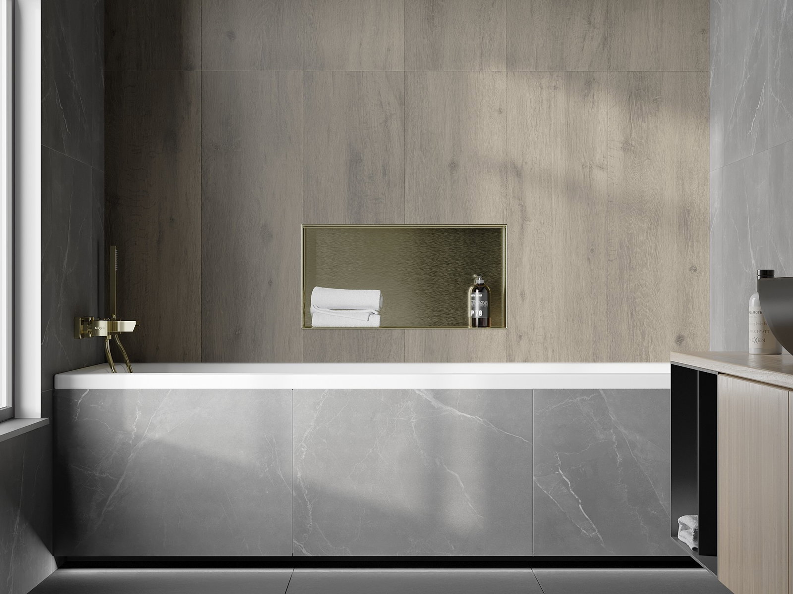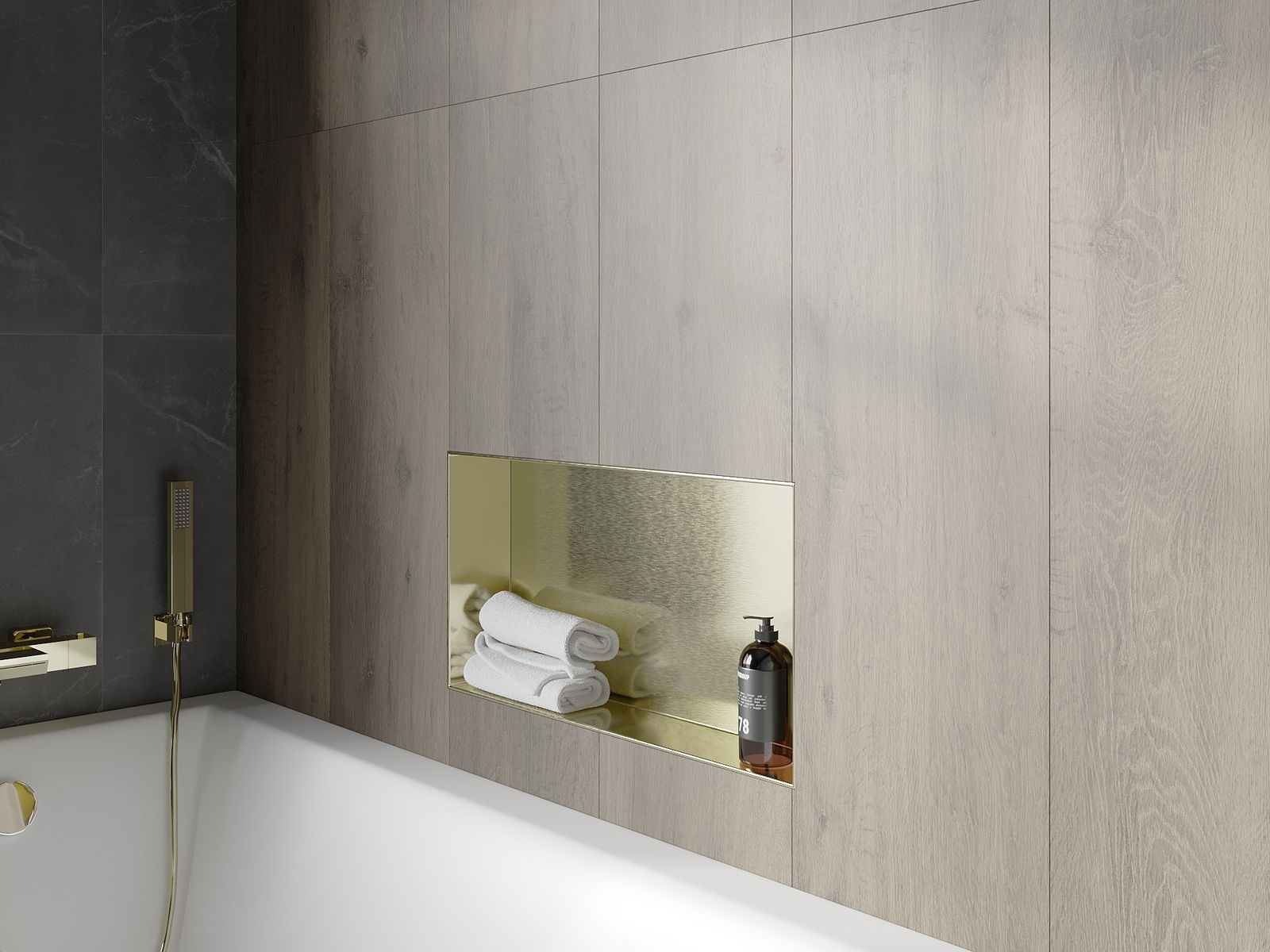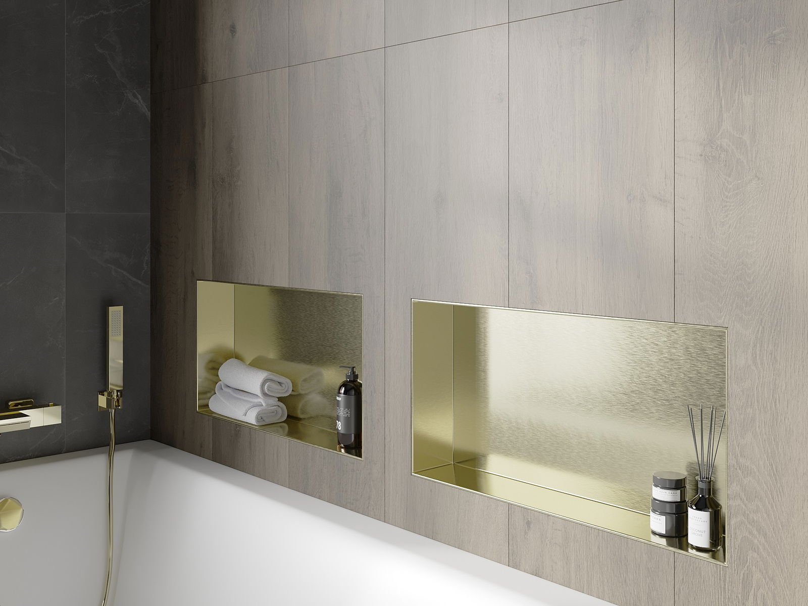 Méiglechkeet fir an der Mauer oder an enger speziell vorbereiten Déposée ze montéieren. Et ass eng extrem modern an funktionell Léisung, déi Plaz spuere léisst an de Produit un d'Esthetik vun den Interieur upassen an eng zesummegepasst Kompositioun schafen.