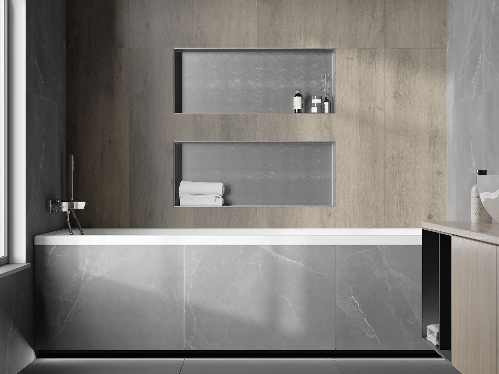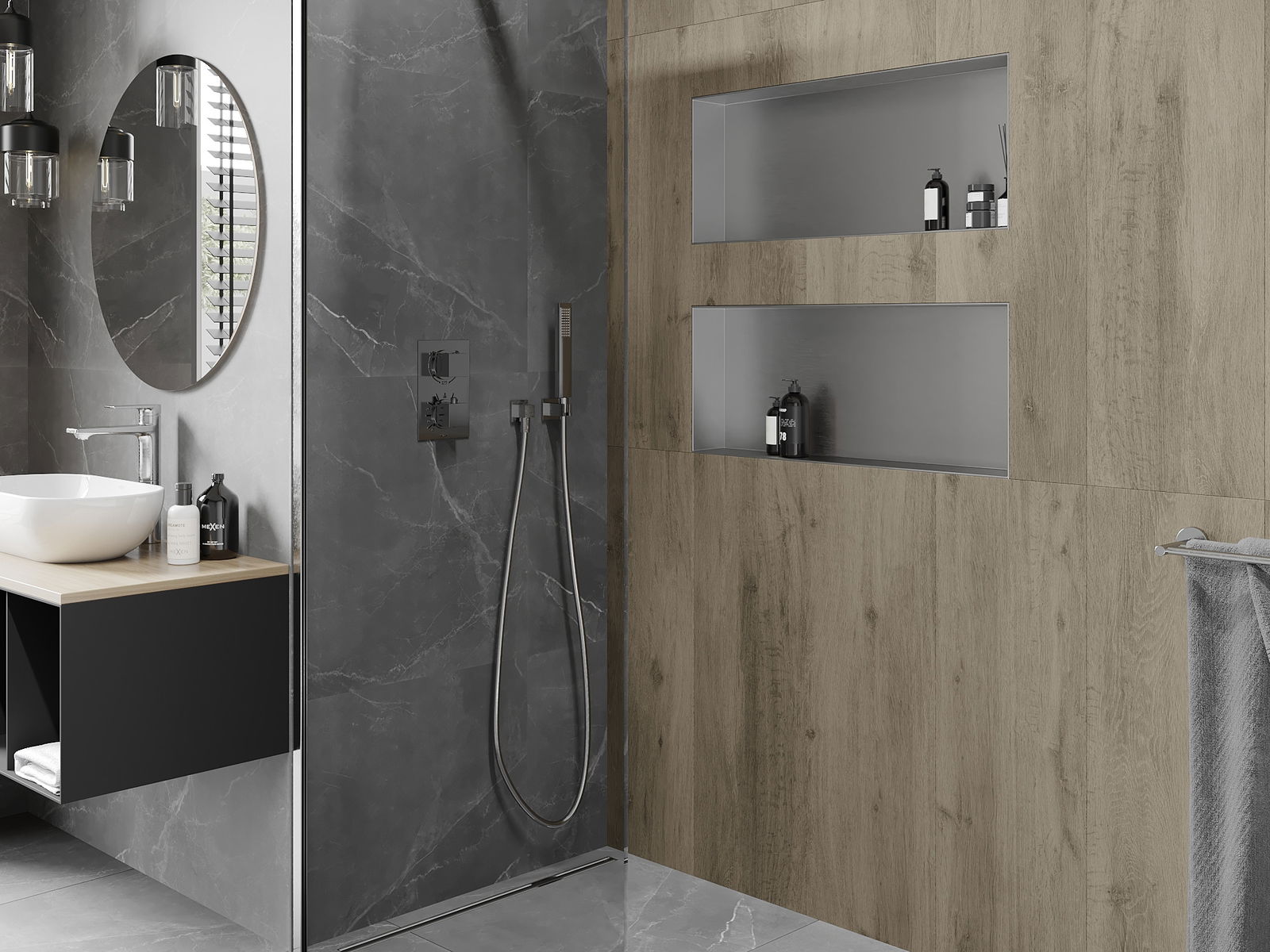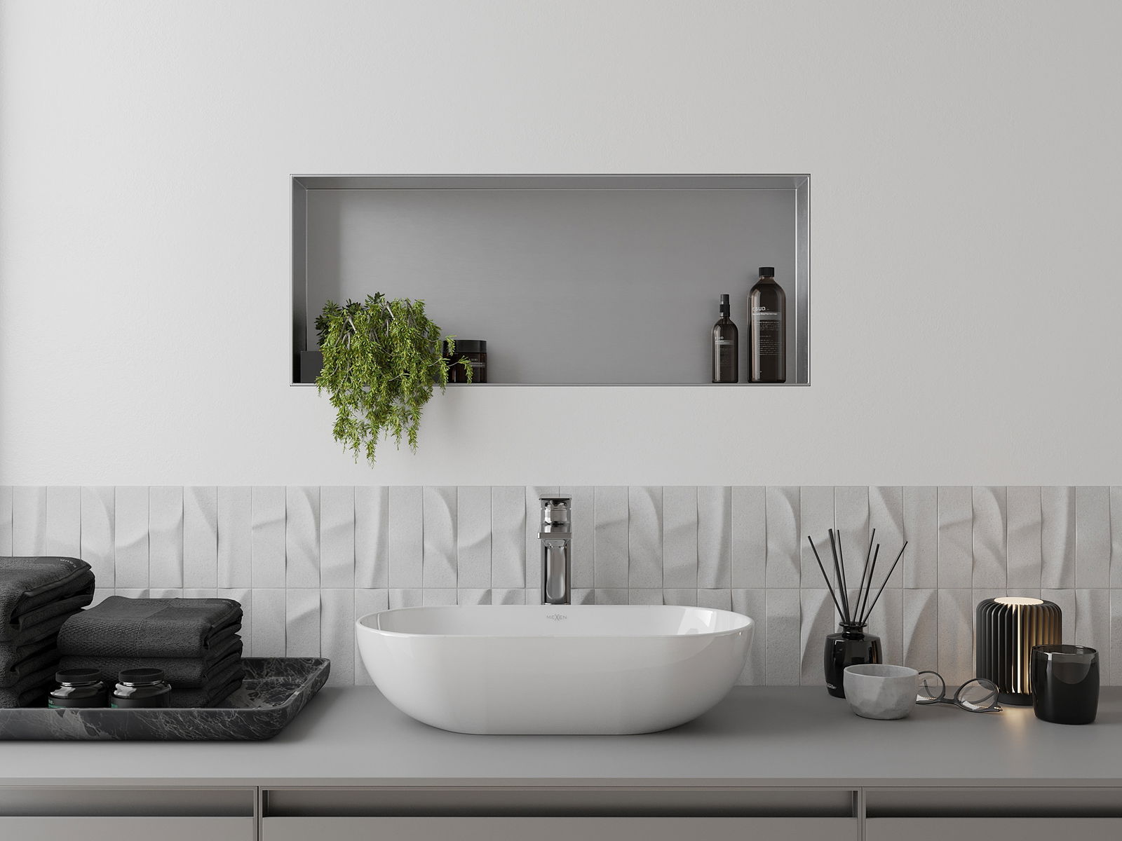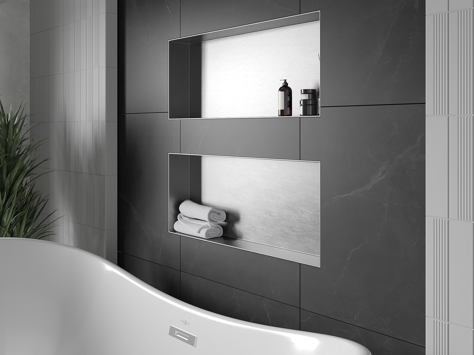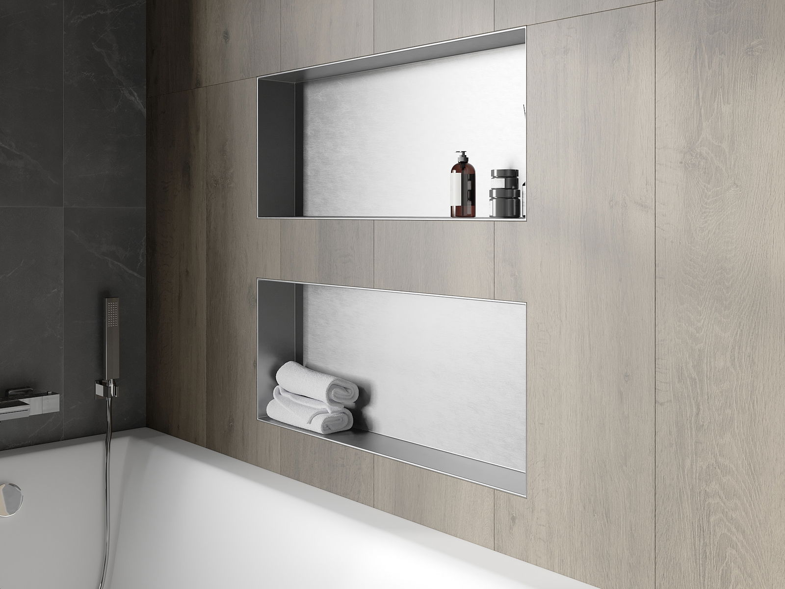 Méiglechkeet fir an der Mauer oder an enger speziell vorbereiten Déposée ze montéieren. Et ass eng extrem modern an funktionell Léisung, déi Plaz spuere léisst an de Produit un d'Esthetik vun den Interieur upassen an eng zesummegepasst Kompositioun schafen.