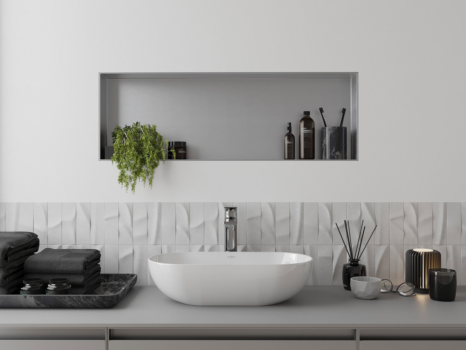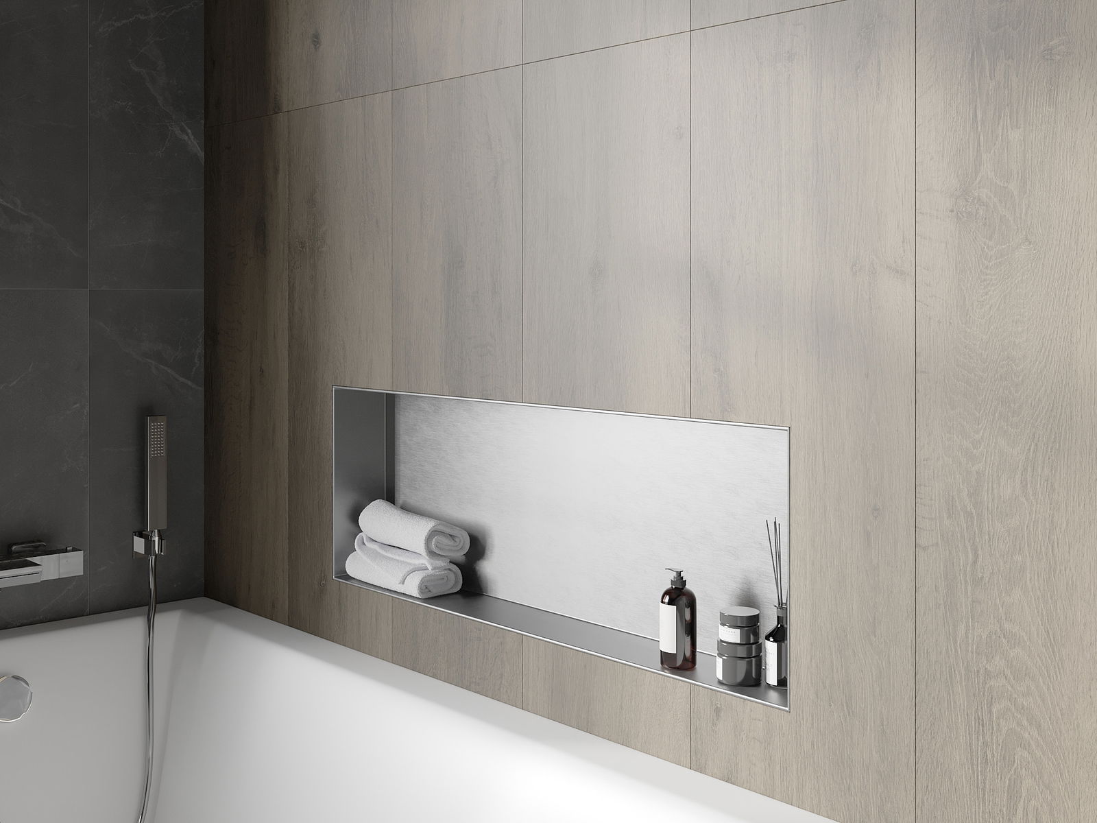 Méiglechkeet fir an der Mauer oder an enger speziell vorbereiten Déposée ze montéieren. Et ass eng extrem modern an funktionell Léisung, déi Plaz spuere léisst an de Produit un d'Esthetik vun den Interieur upassen an eng zesummegepasst Kompositioun schafen.