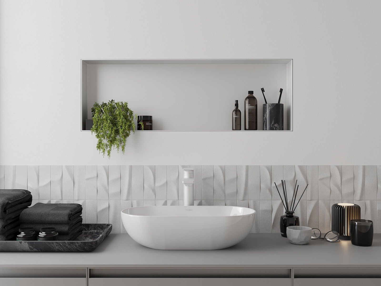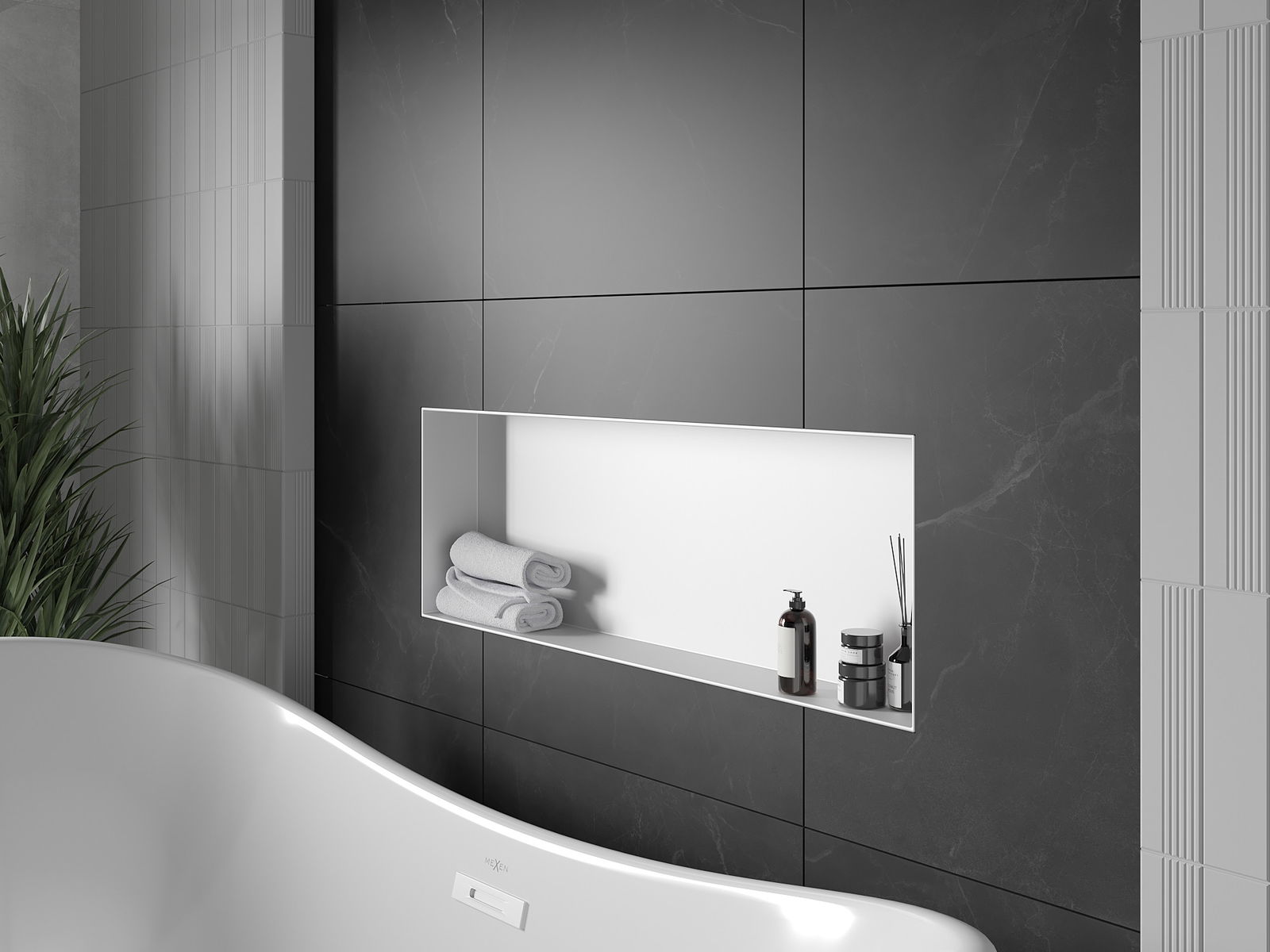 Méiglechkeet fir an der Mauer oder an enger speziell vorbereiten Déposée ze montéieren. Et ass eng extrem modern an funktionell Léisung, déi Plaz spuere léisst an de Produit un d'Esthetik vun den Interieur upassen an eng zesummegepasst Kompositioun schafen.
