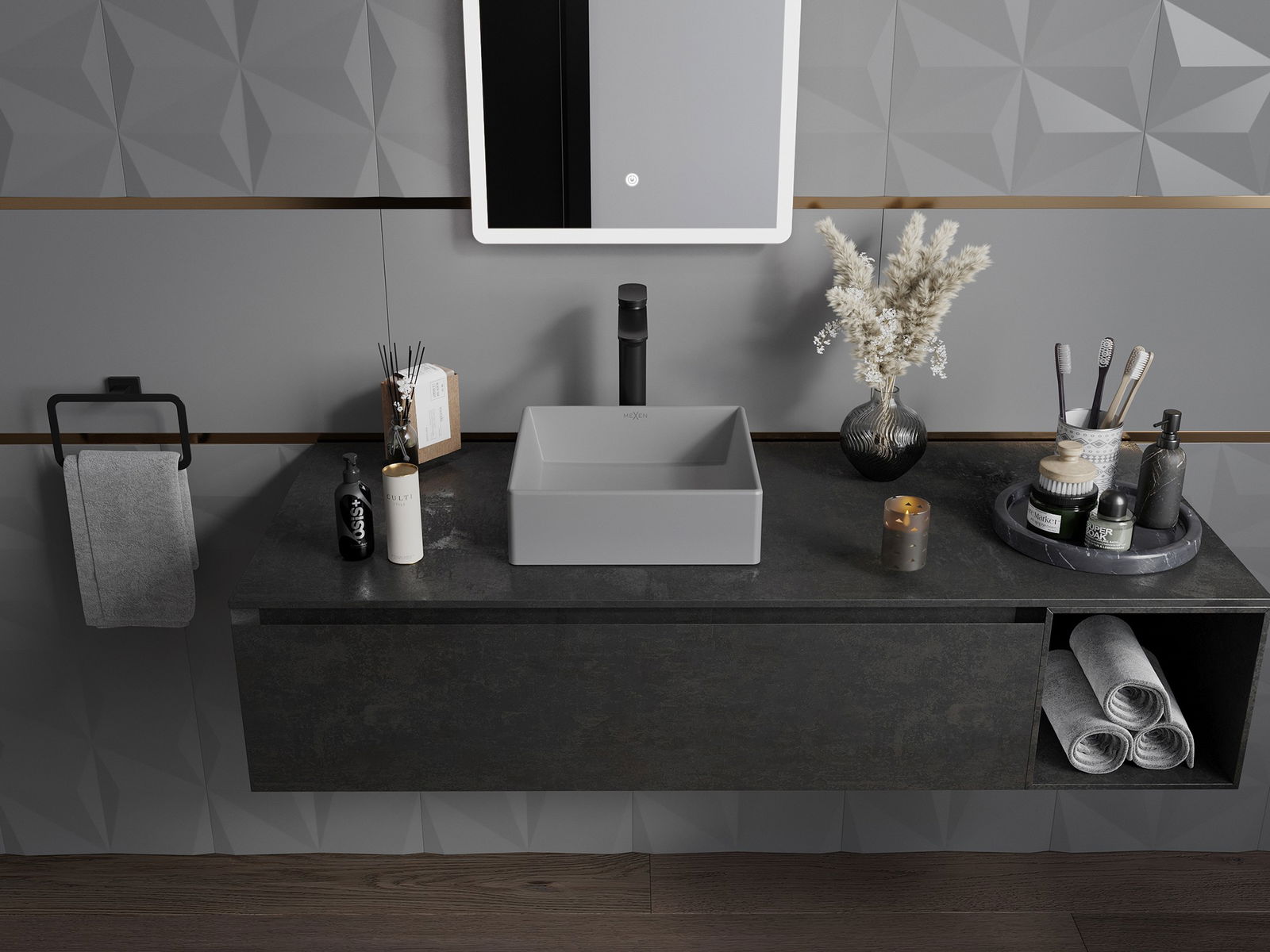 Eng keramiks Uewerfläch mat matte Textur ënnersträicht de Charakter vun der Faarf vum Produkt perfekt a gëtt him en eenzegaartegt an aussoosstarke Finish. Déi subtil Struktur vun der matte Keramik bréngt Eleganz an d'Buedzëmmer an schaaft en ästheteschen Raum.