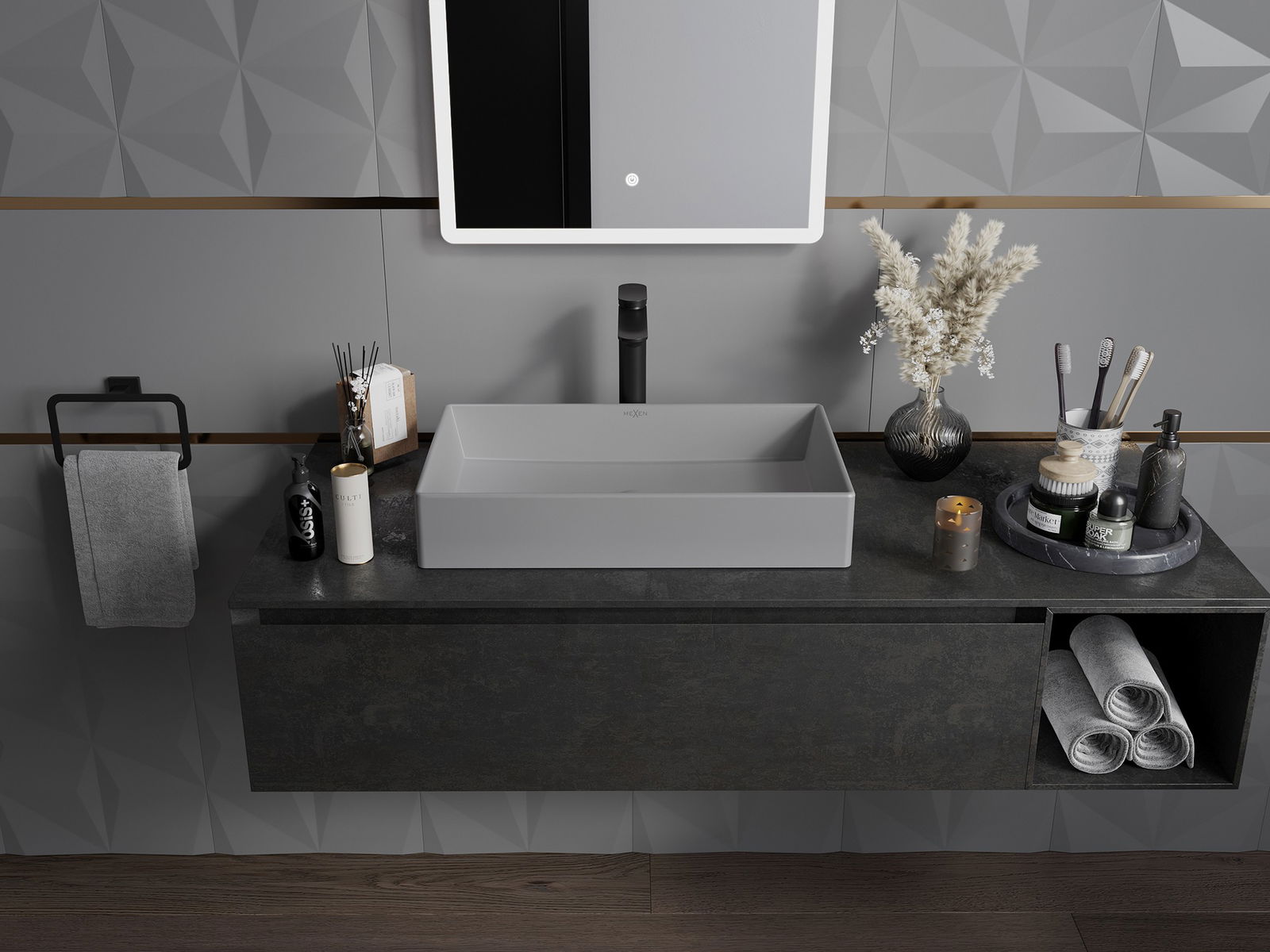 Eng keramiks Uewerfläch mat matte Textur ënnersträicht de Charakter vun der Faarf vum Produkt perfekt a gëtt him en eenzegaartegt an aussoosstarke Finish. Déi subtil Struktur vun der matte Keramik bréngt Eleganz an d'Buedzëmmer an schaaft en ästheteschen Raum.
