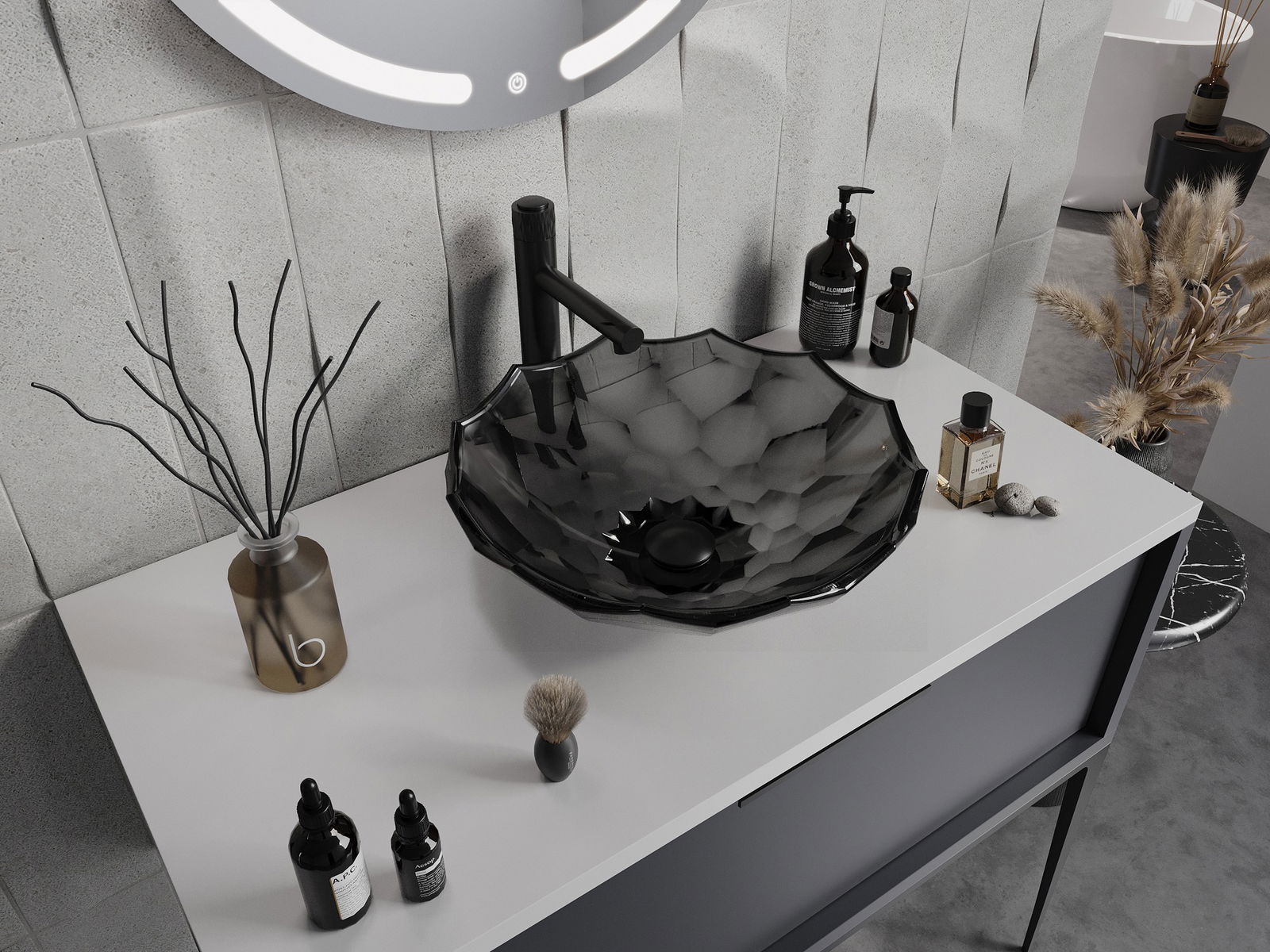 D'Wuechtbecken huet eng aussergewéinlech Kristallstruktur, déi him e einzigartigen an immens impressionanten Ausgesinn gëtt. D'Kristaller blénken am Liicht, fänken d'Aen op a ginn Eleganz. Eng praktesch a stilvoll Léisung fir all Buedzëmmer.