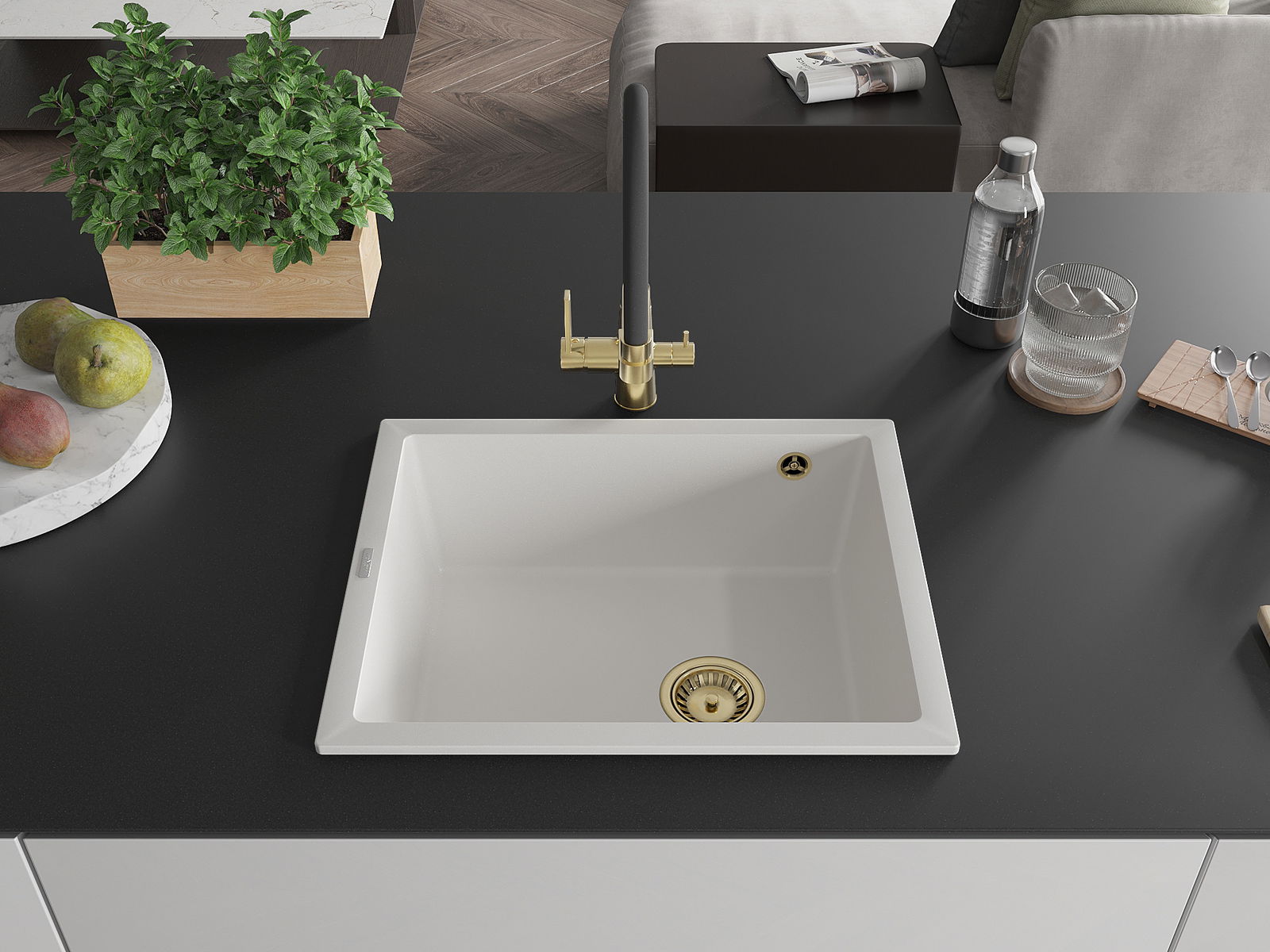 Mexen Pedro Granit-Spullsteen mat enger Schoss 560 x 460 mm, wäiss, gëllene Siphon - 6508561000-20-G