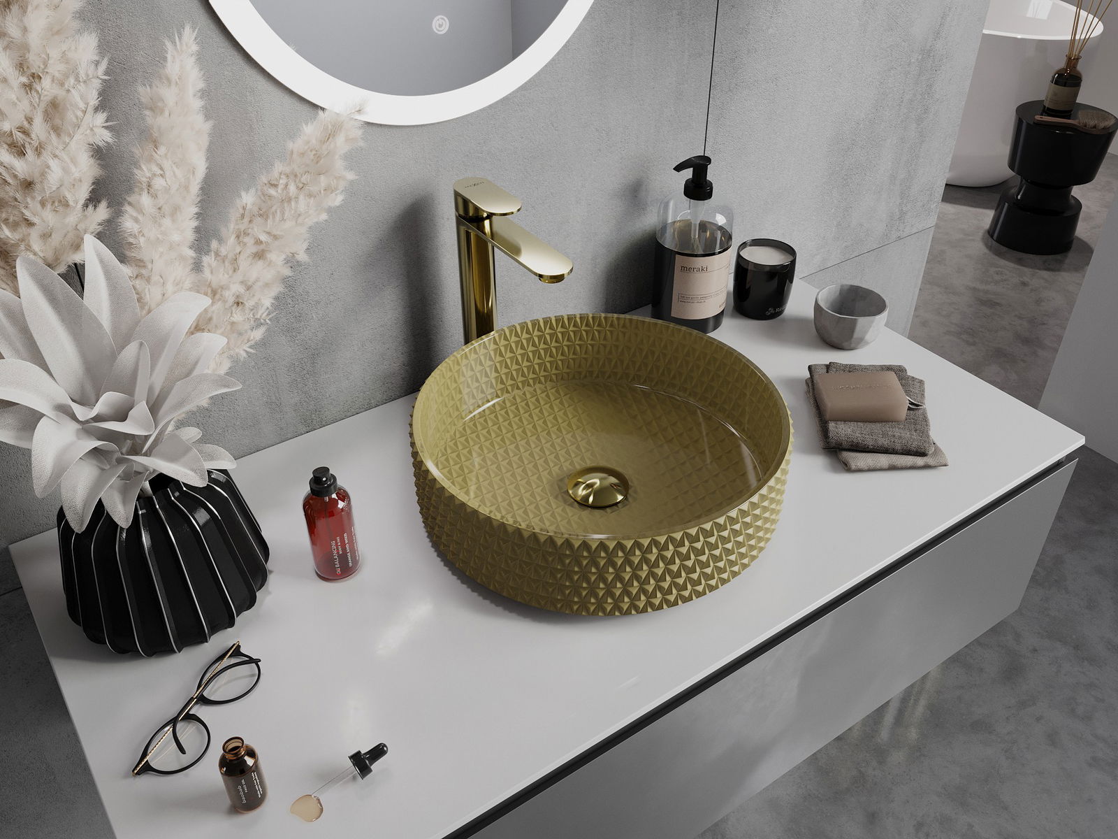 D'Wuechtbecken huet eng aussergewéinlech Kristallstruktur, déi him e einzigartigen an immens impressionanten Ausgesinn gëtt. D'Kristaller blénken am Liicht, fänken d'Aen op a ginn Eleganz. Eng praktesch a stilvoll Léisung fir all Buedzëmmer.