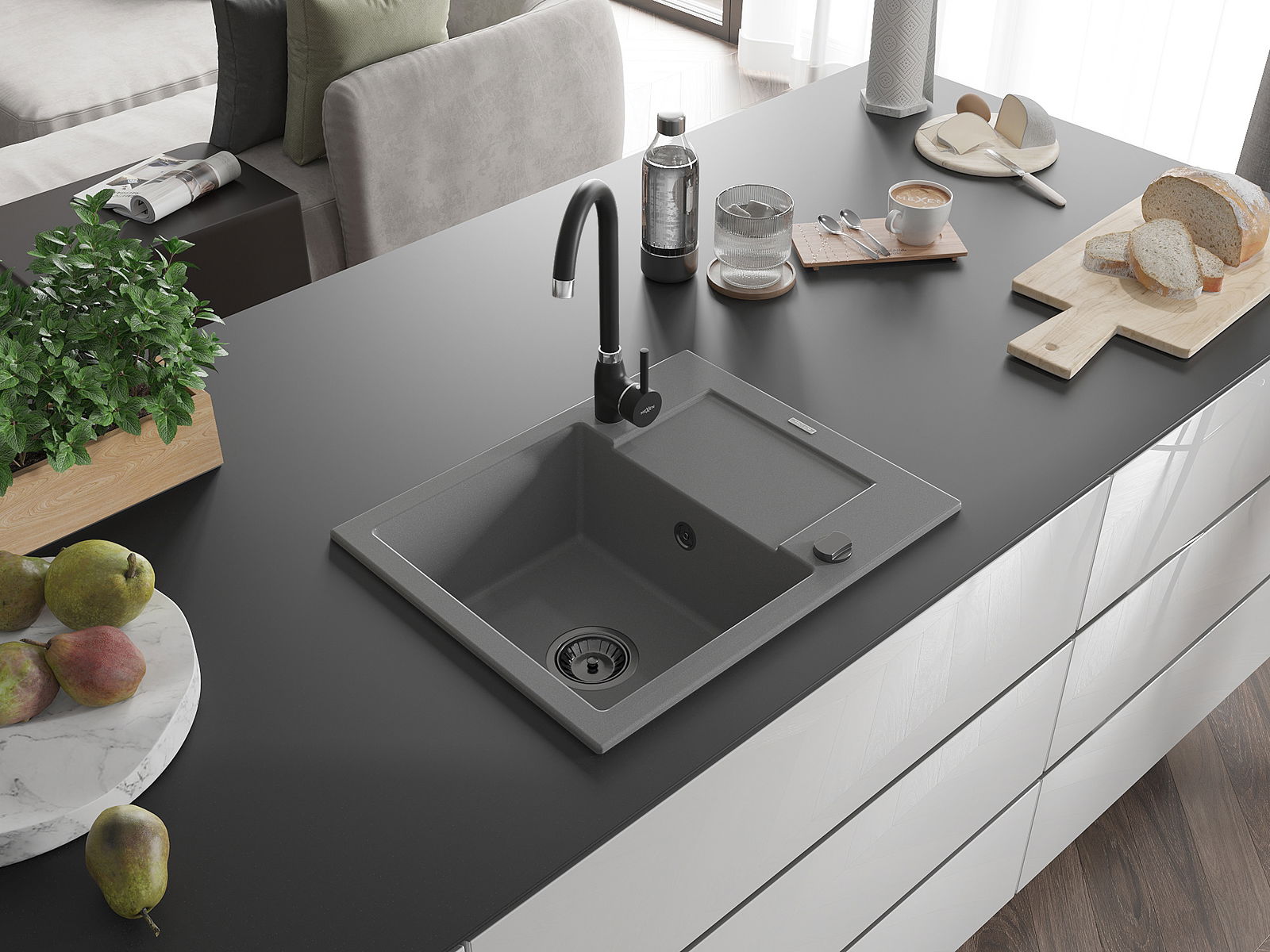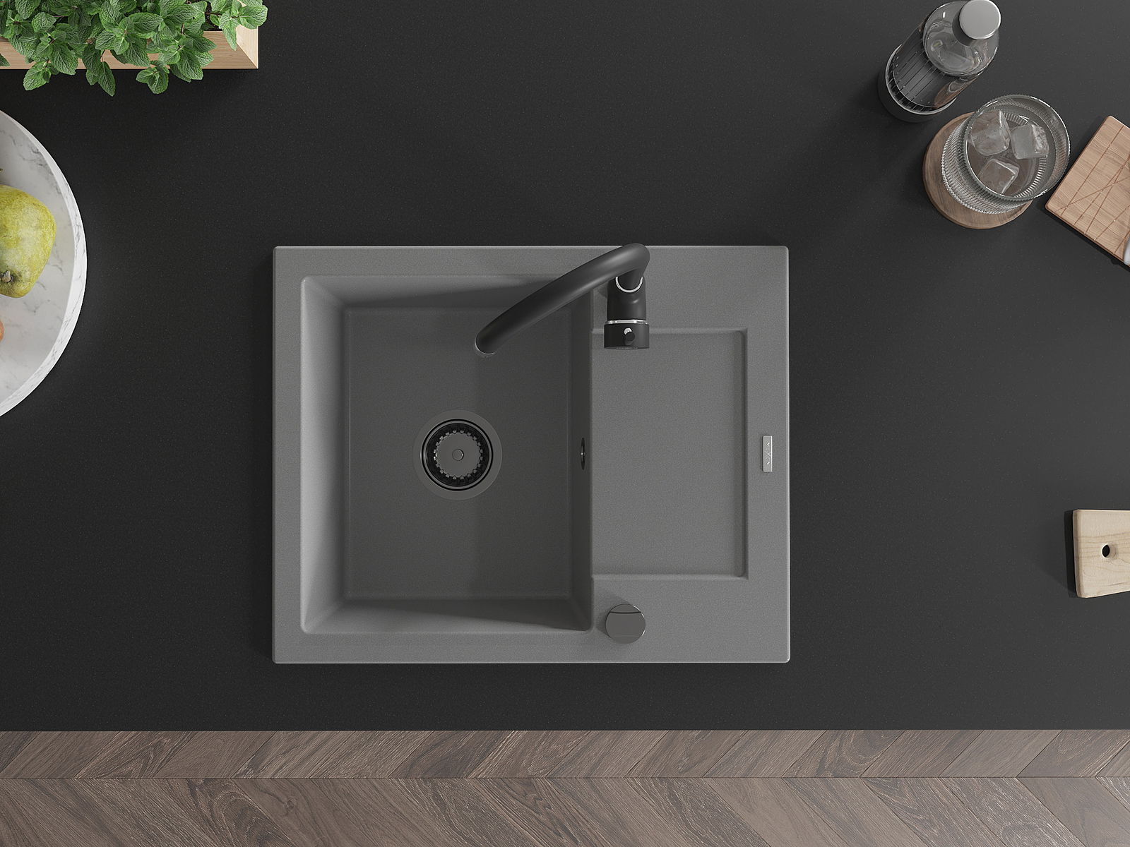 Den Ëmwäschbecken ass aus héichwäertege Granit gemaach. Et stellt eng elegant awer virun allem praktesch Ergänzung fir all Kichen duer, onofhängeg vun hirem Stil. Déi héich Qualitéit an Haltbarkeet vum Granit suergen fir méi järelaang Benotzung.