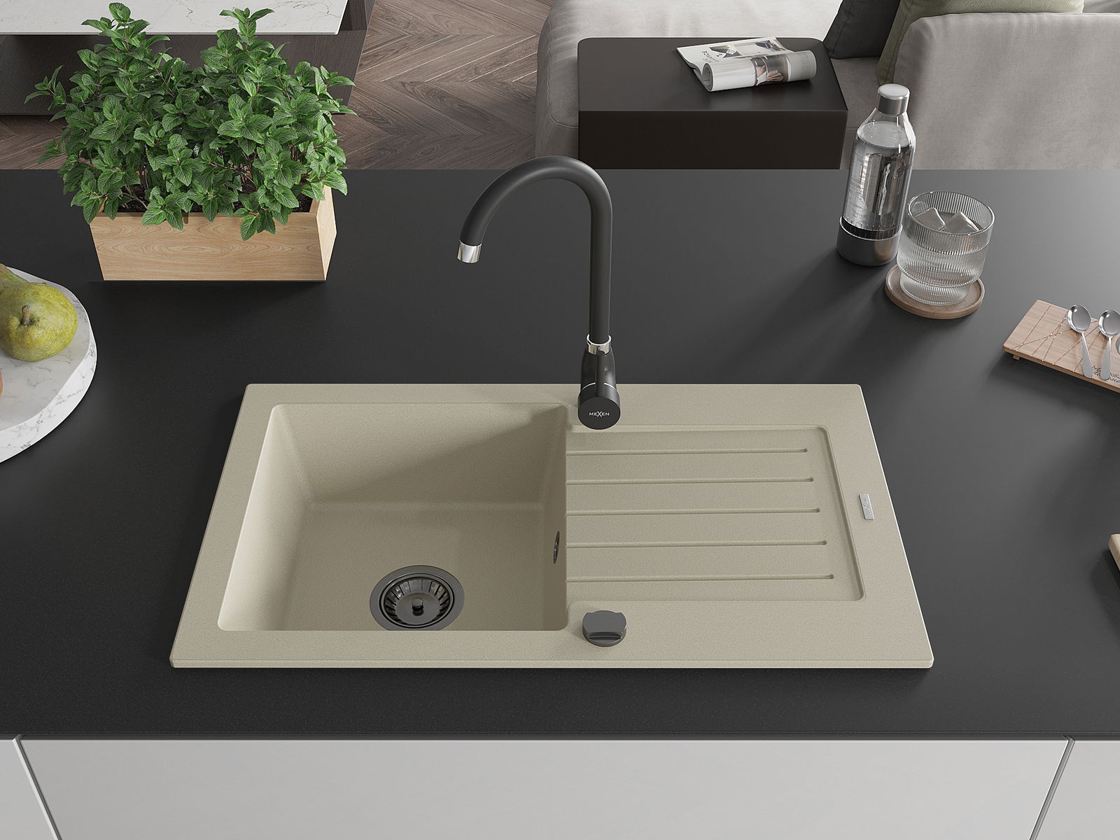 Den Ëmwäschbecken ass aus héichwäertege Granit gemaach. Et stellt eng elegant awer virun allem praktesch Ergänzung fir all Kichen duer, onofhängeg vun hirem Stil. Déi héich Qualitéit an Haltbarkeet vum Granit suergen fir méi järelaang Benotzung.