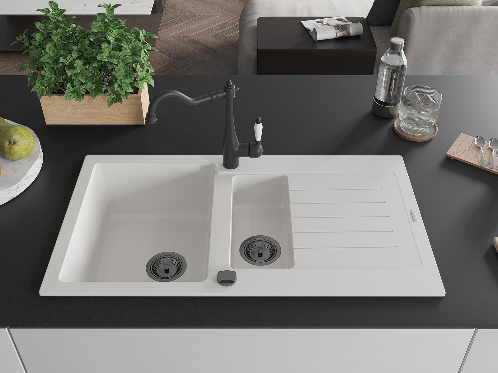 Mexen Matias Granitspullit mat 1,5-Chamber mat Drëpsplack a Kichenbatterie Carla, wäiss - 6502-20-670700-70