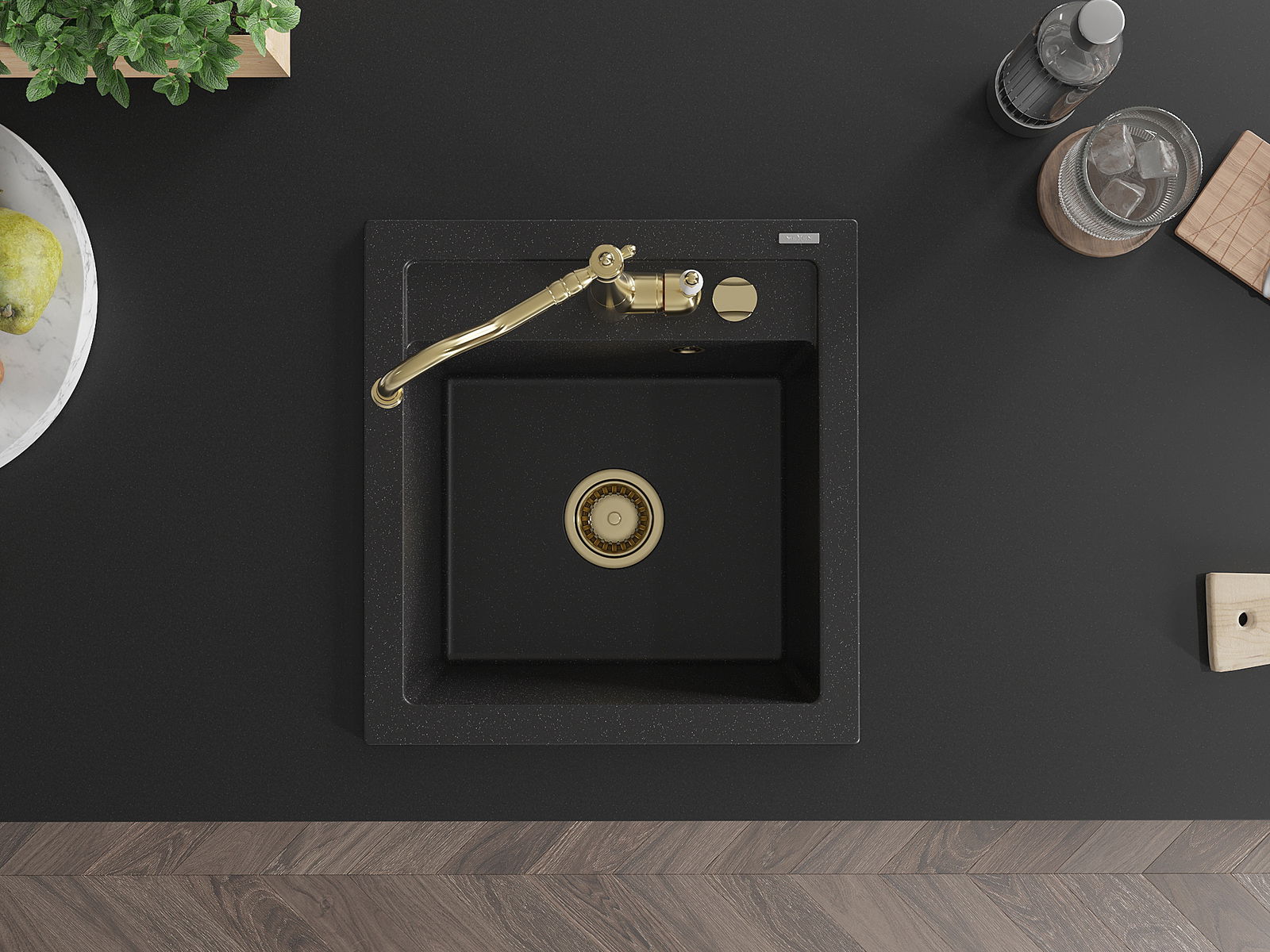 De Spullsteen huet e virgefraist Lach mat engem Duerchmiesser vu 35 mm fir selwer auszeschloen. Et kann ënner anerem genotzt ginn fir e Spender fir Flëssegkeet z'installéieren, deen d'Präsenz vu Plastikfläschen an der Kichen eliminéiert an hir en elegante Finish gëtt.