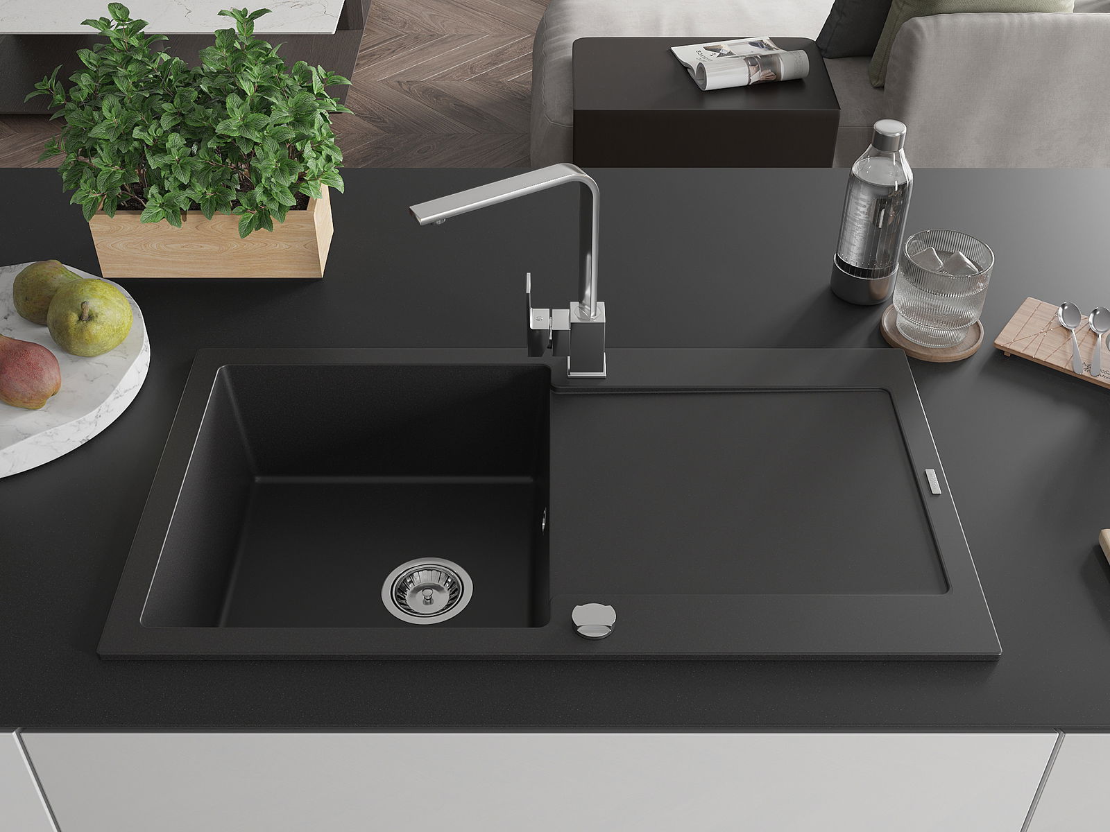 Mexen Leo Granit-Spullsteen 1-Kummer mat Oflaafbehälter a Kichendämmkraan Rita, schwaarz - 6501-77-670300-00