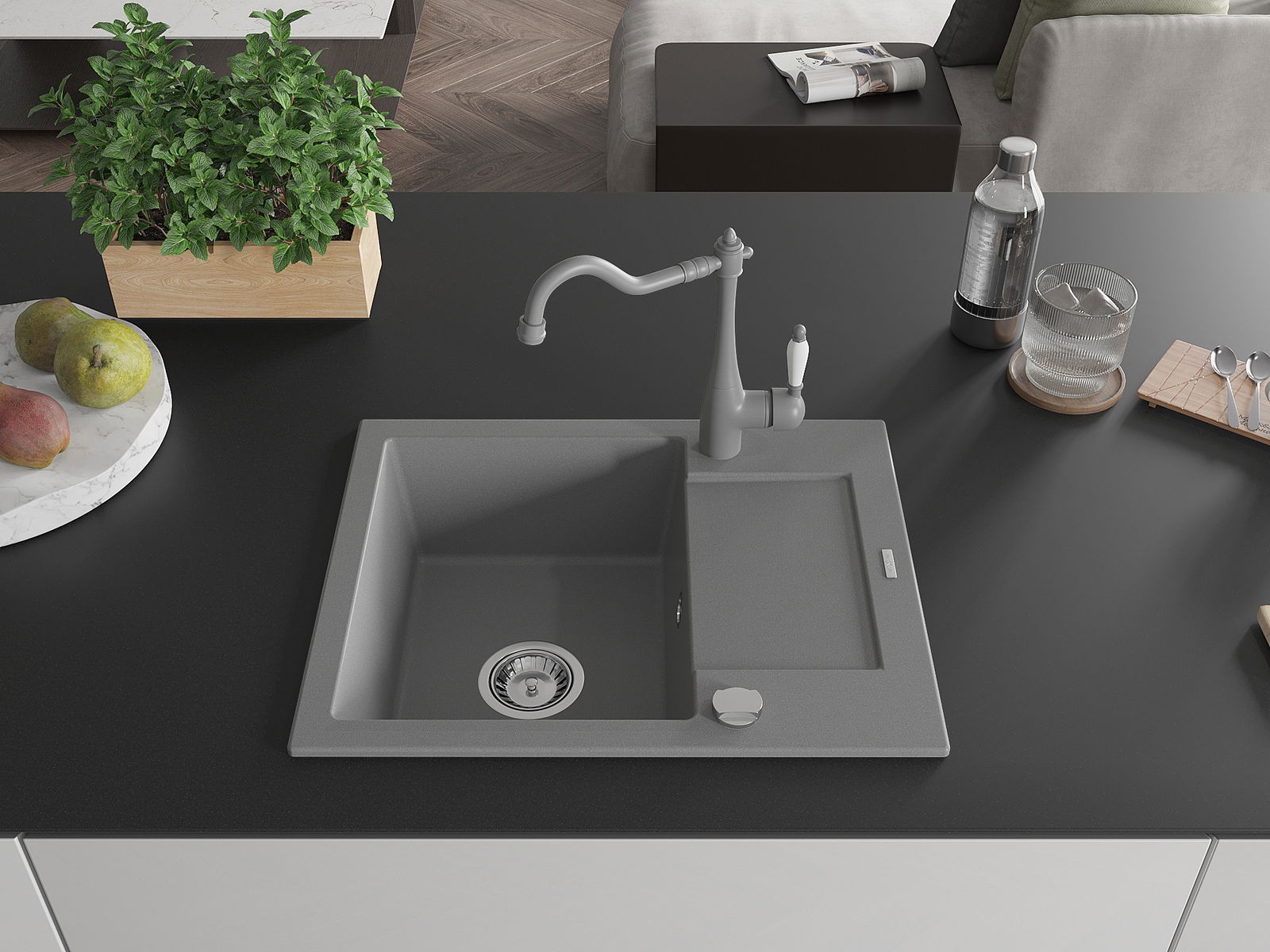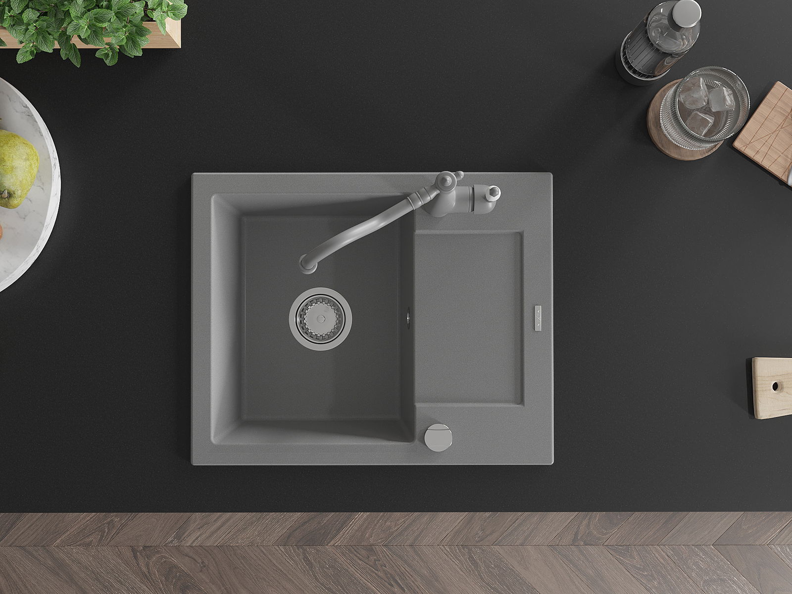 Den Ëmwäschbecken ass aus héichwäertege Granit gemaach. Et stellt eng elegant awer virun allem praktesch Ergänzung fir all Kichen duer, onofhängeg vun hirem Stil. Déi héich Qualitéit an Haltbarkeet vum Granit suergen fir méi järelaang Benotzung.